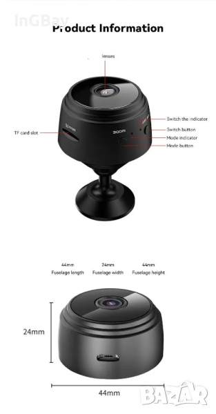 Описание- Безжично свързване :Няма нужда от сложно окабеляване, камерата се свързва безжично към домашната ви мрежа.- Гласов записвач :Записвайте важните моменти с вградения гласов записвач.- Видео с висока разделителна способност :Заснемайте ясни кадри с 2,0-мегапикселовия обектив и запис на видео с висока разделителна способност.- Цветно нощно виждане :С цветното нощно виждане можете да виждате всичко ясно дори при слаба осветеност.Спецификации:Кадри: 30Формат на видеото:: ASFЪгъл на видимост: 150 градусаВреме за непрекъснат запис: повече от 1 часРазмер: 4,3*4,3*2,5 смФормат на компресия: H.264Обхват на запис: 5m2Консумация на енергия: 240MA | 3,7VПоддръжка на памет: Micro SD карта (TF карта) може да се разшири до 64G1. Висококачествен видеозапис: Малката камера A9 осигурява висока разделителна способност 1080P, която може да се записва ясно и детайлно.2. Безжична връзка: Можете да наблюдавате камерата от разстояние чрез WIFI връзка и да получавате достъп до видеоклиповете на мобилни телефони или таблети.3. Функция за запис: В допълнение към видеозаписа малката камера A9 включва и вграден рекордер за заснемане на аудио доказателства.4. Малка компактност: Малка камера A9 е с малки размери и е много подходяща за домашни камери за сигурност.Как да използвате1. Натиснете бутона ON/OFF за около 3 секунди, за да включите камерата.2. Намерете и се свържете с wifi горещата точка на камерата в настройките на WLAN на мобилния телефон. Или сканирайте QR кода на камерата и се свържете с 2,4GHz wifi мрежата на дома си в конфигурацията за wifi в настройките на приложението.3. Гледайте видеото в реално време. Ако искате да запазите видеото, моля, форматирайте TF картата, преди да я използвате. Записвайте видеофайлове и ги записвайте на SD карта (SD картата не е включена в комплекта)Пакетът включва1 *