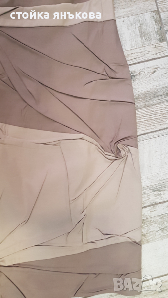 Продавам страхотна официална рокля в два нюанса на бежовото с нагъгрени интересни елементи отпред. Купувана е за 85 лв., не е обличана, нова е. Болерото е отделно с цена 15 лв. Не е към роклята.