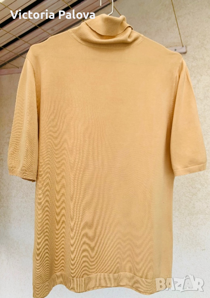 Прекрасно поло за пролетта, има разтегливост, топъл бежов цвят. Рамо - 44см, ГО - 52см, дължина - 66см. Полото има забележка, цената е съобразена с това, отзад под яката има шито.