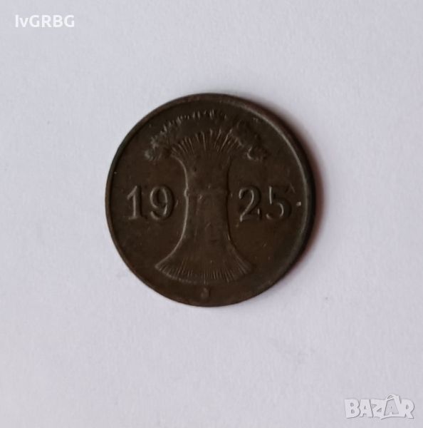 1 пфениг 1925 Германия , немска монета 1 пфеннинг 1925 Германия , 1 пфенниг Германия 1925 буква J ,