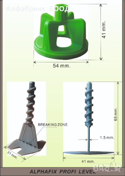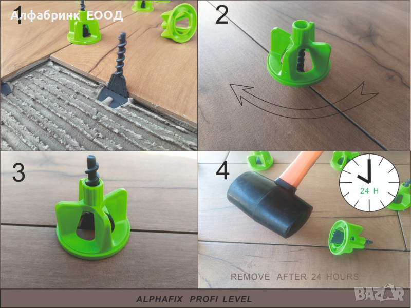 Това води до неравномерен натиск , което понякога може да доведе до нежелани резултати. При системите "винт-гайка" независимо дали полагате плочи с дебелина 5мм. или 15мм. винаги 50% от гайката лежи върху едната и 50% върху другата, което е гаранция за постигане на отличен резултат. Със системата Alphafix Profi level можете да изравнявате плочи с дебелина от 3 мм. до 21 мм.
