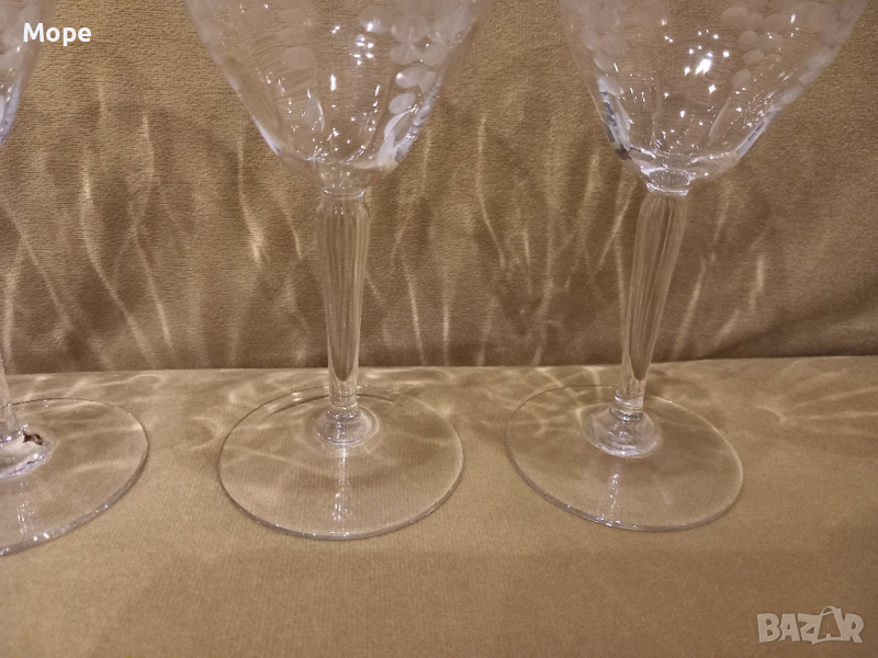 Три броя кристални чаши, оловен кристал, с вместимост 150 мл.,височина 15 см.,диаметър на основата 7.0 см,диаметър на отвора 8 см. с рисунка лозов грозд.