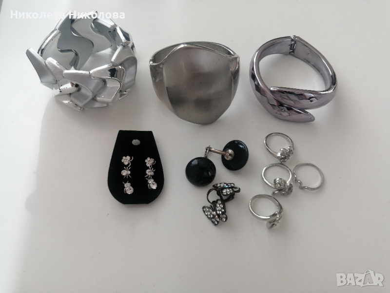 Цена на две от гривните 5лв., на металната 10лв. Цена на пръстените по 2лв.,цена на обеците всеки един комплект по 4лв., цена на часовника 10лв.,като е за смяна на батерията. Цена за огърлицата 10лв. Комплекта на 3бр. обеци е 9лв. При интерес пишете съобщение.