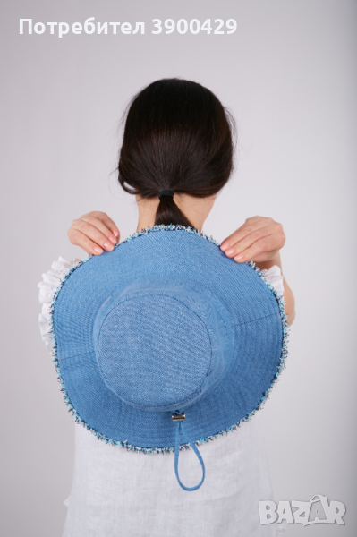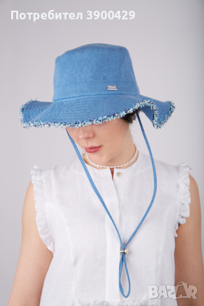 Лятна Дамска Шапка с голяма периферия - 9см, изработена от памучен деним, с декоративни тегели. Модела е с памучна подплата и размера може да се регулира към по-малък чрез стягане на връзките в задната част.