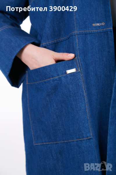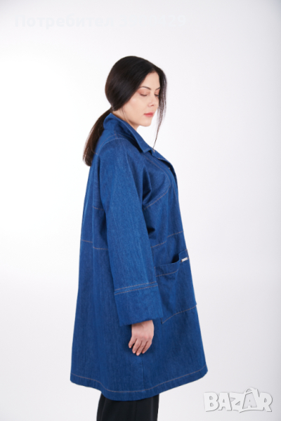 Пролетно деним дамско палто с oversize прав силует, класическа якичка, дълги и широки ръкави, които завършват с обърнат маншет.