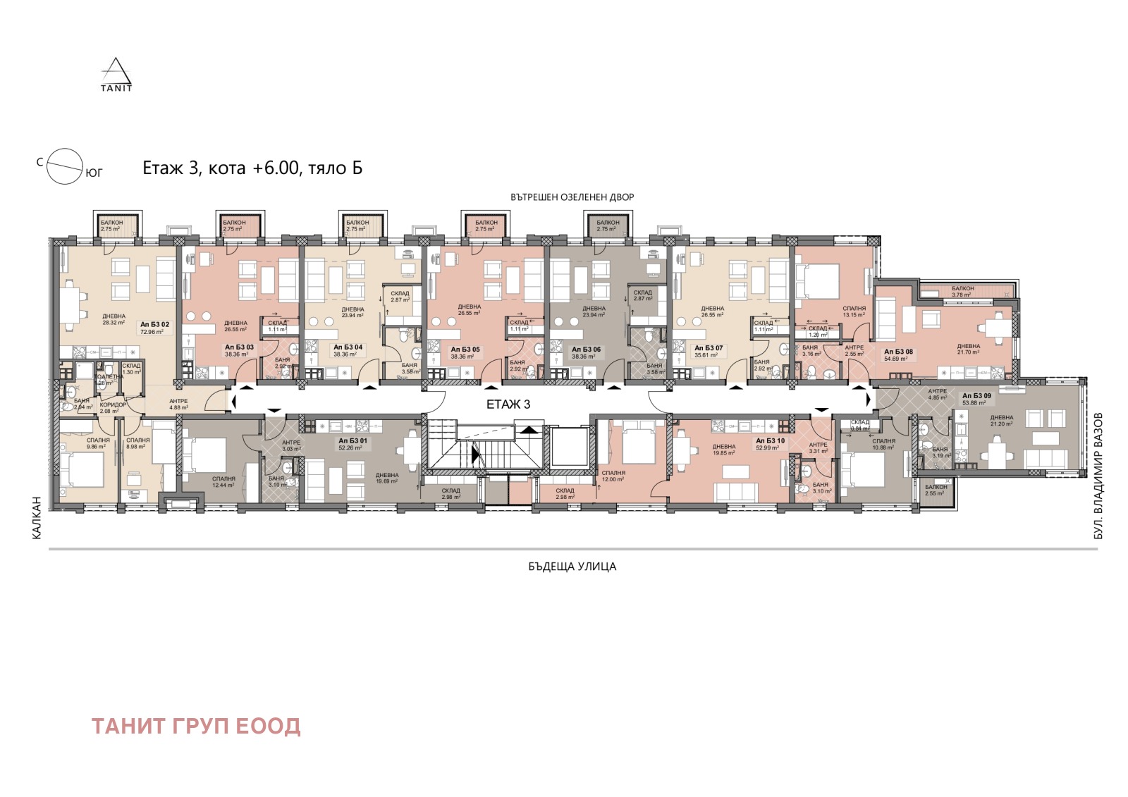 Предлагаме за продажба ап. Б3 09, двустаен, на трети жилищен етаж (кота +6,00м.) със ЗП 54 кв.м. (68кв.м. с вкл. общи части и склад от 3кв.м.) с прекрасно южно изложение в новата ни сграда Lion Hill етап 2. Цената на апартамента е 147 000 евро с вкл. ДДС. Аналогичен апартамент е свободен и на втори етаж (Б2 09). В етап 1 и етап 2 все още има избор на едностайни, двустайни, тристайни, четиристайни апартаменти с различни големини и изложения, на различни етажи, както и паркоместа - разгледайте всички свободни обекти на уебсайта ни tanit.bg.