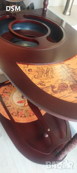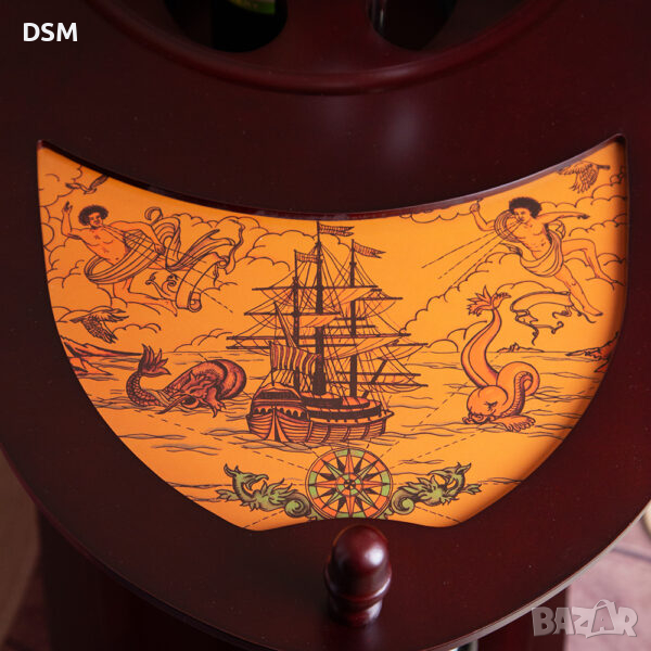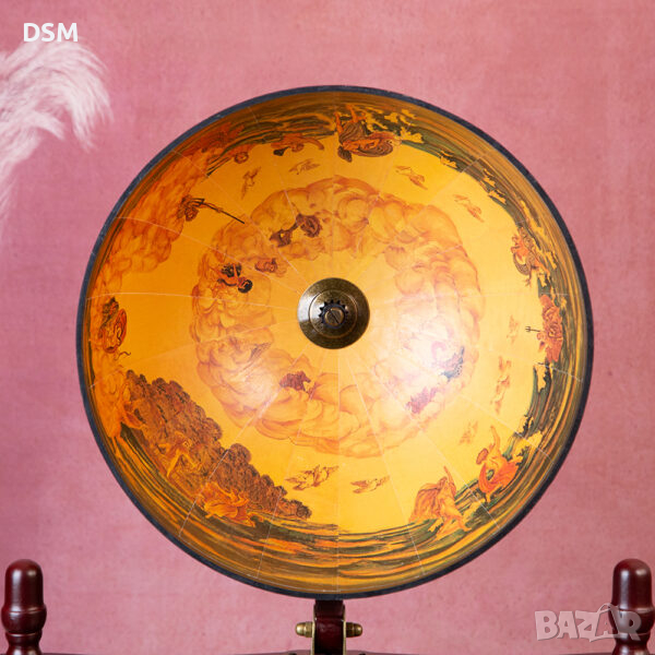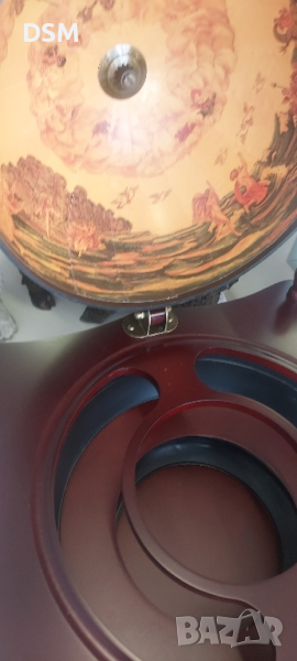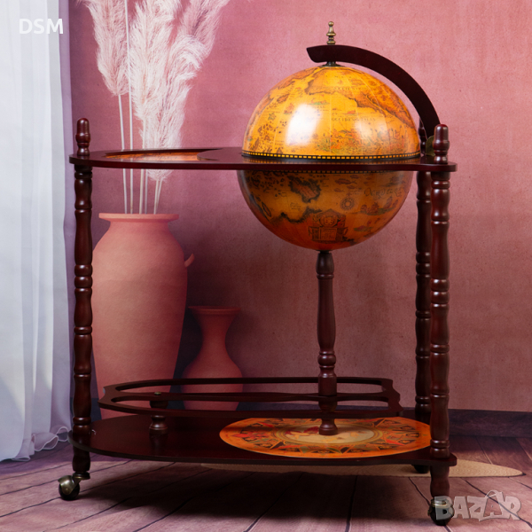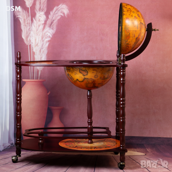 Подвижен глобус бар с място за бутилки в долната си част и място за бутилка и чаши от горната.Изрисуван със старинна карта на света от външната страна и небесното царство от вътрешната.