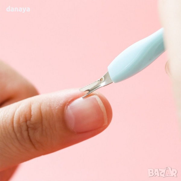 Всеки двустранен инструмент за перфектен маникюр от едната си страна е резец за кожички, а от другата е избутвач за кожички. С него може да се нанасят и различни декорации върху ноктите. Дръжката е пластмасова. Чудесен инструмент за красив маникюр.