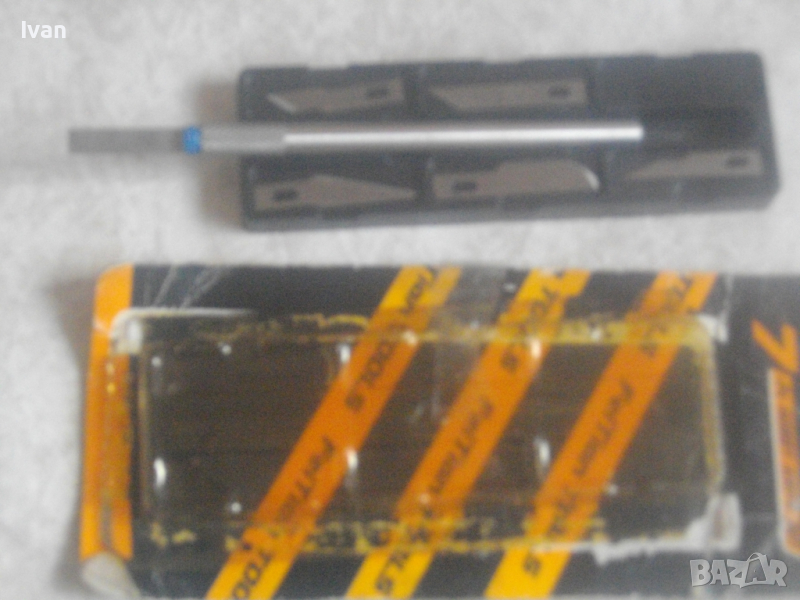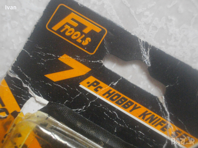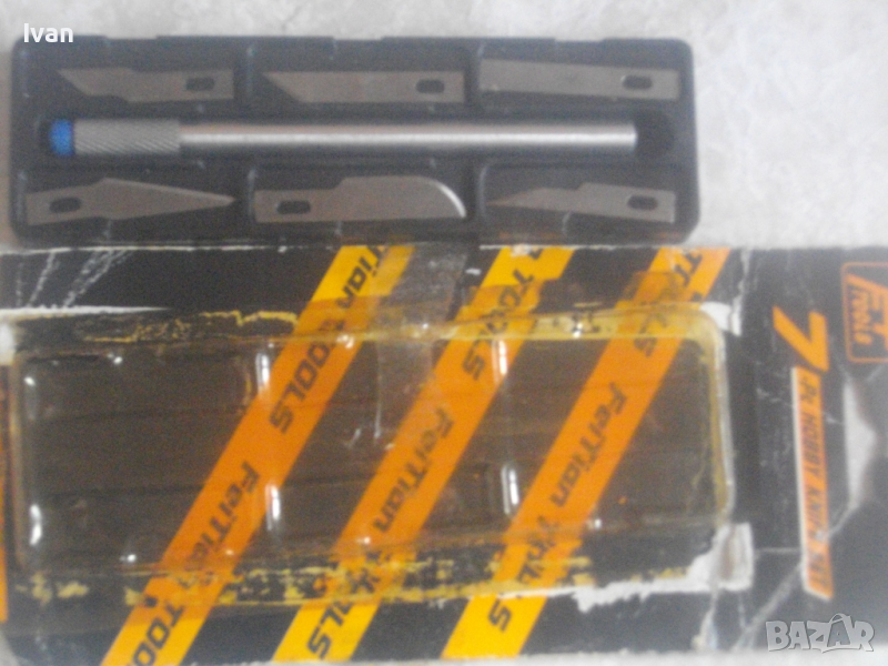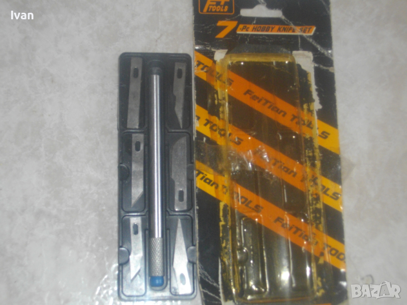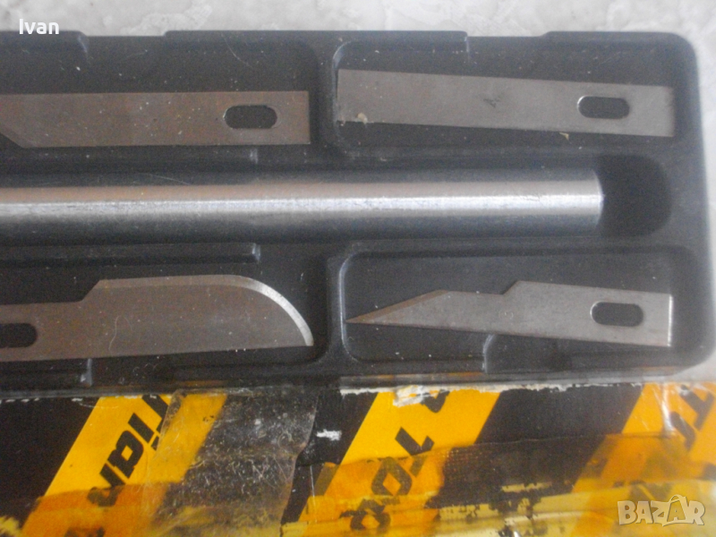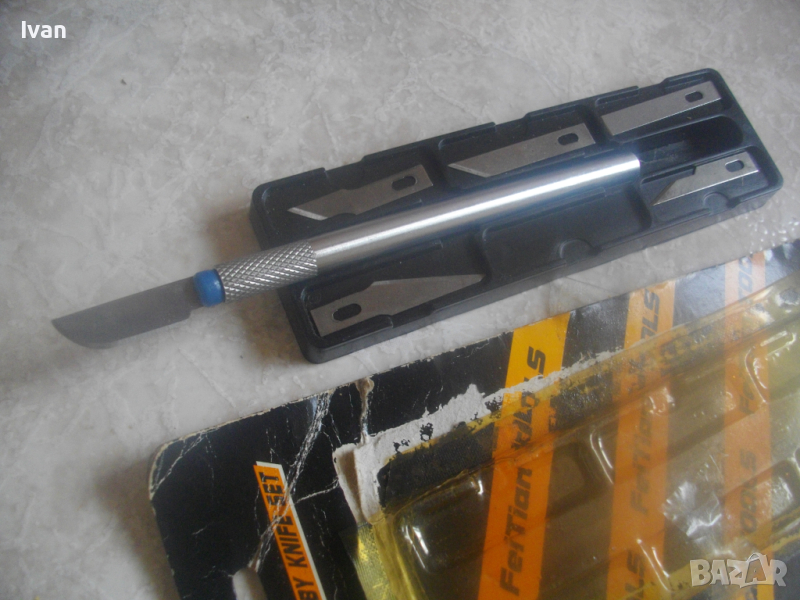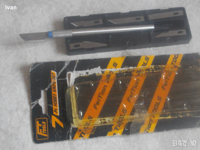 ОПИСАНИЕ на нов комплект 6 броя резци за линолеум /балатум/ и карвинг в различни неметални повърхности - цена 69,00 лв. Съвсем нов комплект Резци за рязане и графиране на линолеум - Карвинг. Масивна метална дръжка с пластмасова глава - държач с прорези, в който се поставя острието. Затягане на главата - масивно метално. 6 броя различни резци от закалена стомана. На опаковката е вписано на латиница: FT Tools HOBBY KINIFE SET.