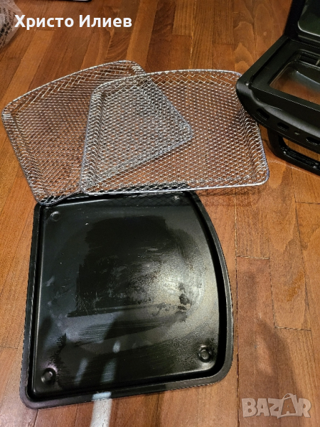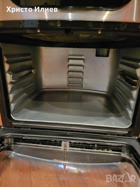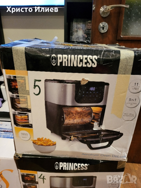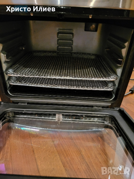 В много добро състояние. Има предоставени реални снимки. Налични са тавичките от допълнителните аксесоари. В оригинална опаковка.Пригответе най-добрия и хрупкав чипс или пилета на грил благодарение на въртящата се кошница с практична дръжка и грил11 литра обем и 1800 вата мощност - пригответе цяло ястие наведнъж без никакви проблеми.Дигитален сензорен екран за регулиране и регулиране на температурата от 65˚ до 200˚C10 предварително програмирани настройки, които ви позволяват лесно да приготвяте чипс, риба, месо или сладкиши, но също така да дехидратирате плодове и зеленчуци.Благодарение на технологията за високоскоростна въздушна конвекция, фурната Aerofryer е идеална алтернатива на обикновената фурна с конвекция.Трудите ли се да изберете между диван с конвекция и фритюрник с горещ въздух? Няма проблем – просто вземете Princess 182075 Aerofryer Oven Deluxe. Тази комбинация от фритюрник с горещ въздух и фурна осигурява оптимална конвекция на печка с удобния, компактен размер на фритюрник с горещ въздух.Никога досега вашата пържена храна не е била толкова добра и здравословна! Тъй като въртящата се телена кошница автоматично обръща вашия чипс, не е необходимо разклащане. За оптимални резултати препоръчваме количество от 750 грама.Производителност: 1800 вата11 литра капацитет5 рафтаТемпературен диапазон: 80-200°CЗащита от прегряване1 решетки за готвенеПодвижна тава за трохиНеплъзгащи се крачетаЗдравословно пърженеБлагодарение на циркулиращия горещ въздух във фурната Princess Aerofryer вече не е необходимо използването на олио за приготвяне на чипс, месо, риба и зеленчуци. Това означава, че можете да готвите по-здравословно и пак да се насладите на цялата храна, която вие и вашето семейство обичате толкова много. Дори закуски, сладкиши или хляб ще бъдат хрупкави и вкусни. Освен това фурната Aerofryer има функция за дехидратация на плодове и зеленчуци. Най-добрият начин да приготвите здравословни закуски като сухи плодови или зеленчукови чипсове за себе си или вашите малки.Лесен за използванеЦифровият сензорен екран ви позволява лесно да изберете правилната температура или желаната програма. Освен това функцията за таймер за 60 минути и защитата от прегряване гарантират, че фурната Aerofryer е безопасна за използване. Със специално проектираната дръжка можете лесно да извадите кошницата и да я изпразните върху чиния, без да се налага да докосвате гореща повърхност.Луксозен дизайнФурната Princess Aerofryer разполага дори с шишче за барбекю, за да можете да приготвите най-вкусното пиле у дома. Капацитет от 11 литра означава, че средно голямо пиле ще се побере напълно във фурната. В комбинация с технологията с горещ въздух, непрекъснатото въртене гарантира, че месото е сочно отвътре и хрупкаво отвън. Мощността от 1800 W също гарантира, че фурната се нагрява много бързо.Програмирани настройкиБлагодарение на програмираните настройки можете да изберете правилната температура и време за печене само с натискане на бутон. Фурната Princess Aerofryer има 10 програмирани настройки за чипс, пържола, сладкиши, пица, хляб, риба, скариди и пилета, както и за печене на скара и нарязване. Просто опитайте всички и изпитайте възможностите, предлагани от фурната Aerofryer. От пържени картофи до приготвяне на месо, риба и зеленчуци с малко или никакво масло е възможно.5