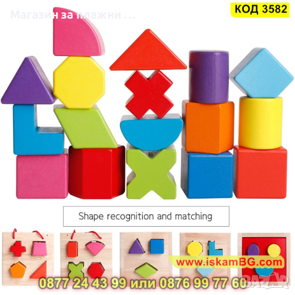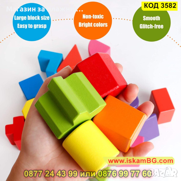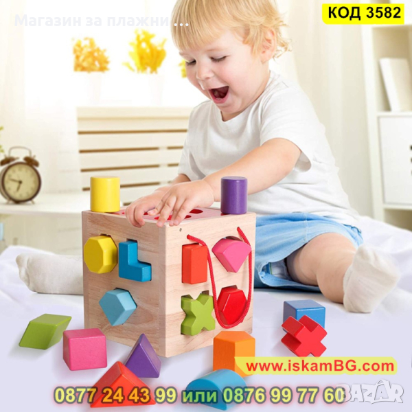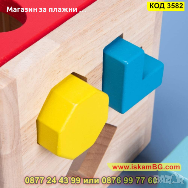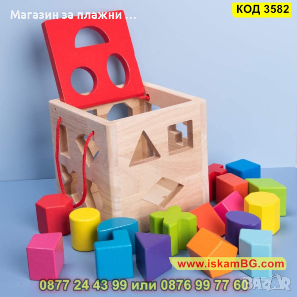 Дървен куб с размери 14.5 х 14.5 см.. Във всяка страна на куба има изрязани отвори с различна геометрична форма. Във всеки отвор може да влезе точно определена геометрична фигура. Геометричните фигури са с различни цветове.