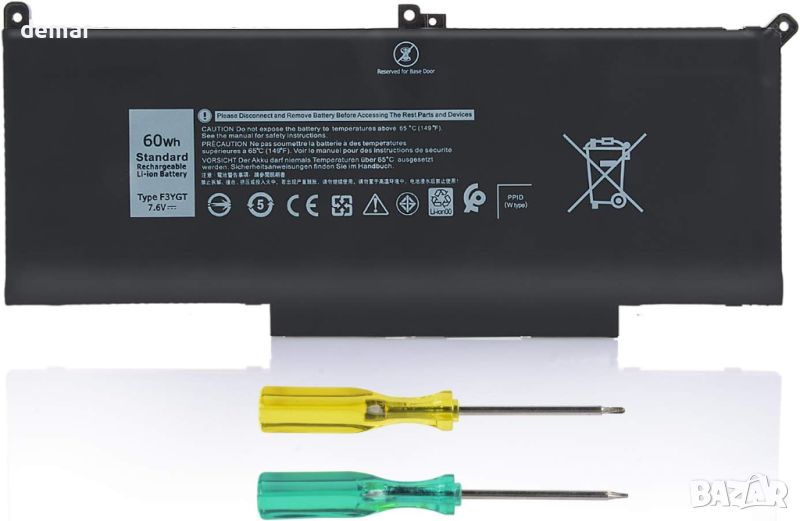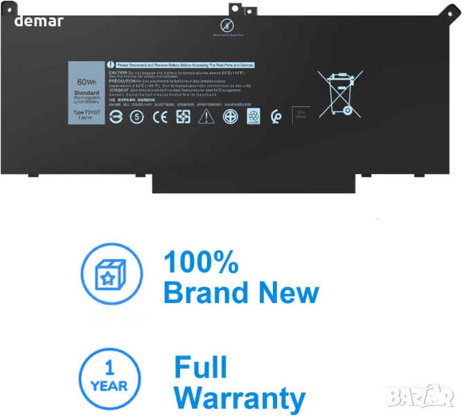 F3YGT Тип батерия - Li-Polymer; Капацитет: 60Wh; Клетки: 4-Клетки; Напрежение: 7.6V. Високопроизводителна резервна батерия Latitude, до 1000 цикъла на зареждане през целия живот на батерията.