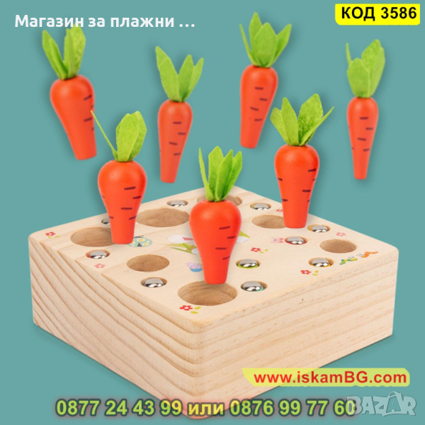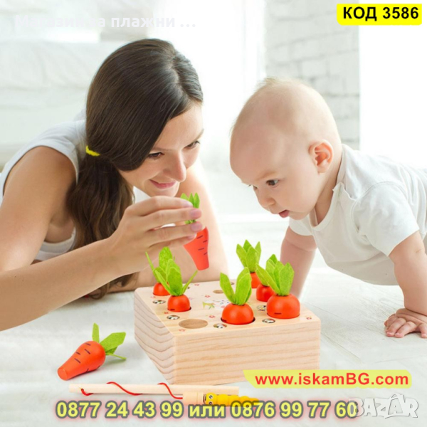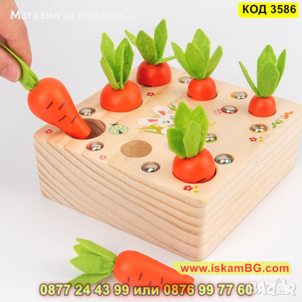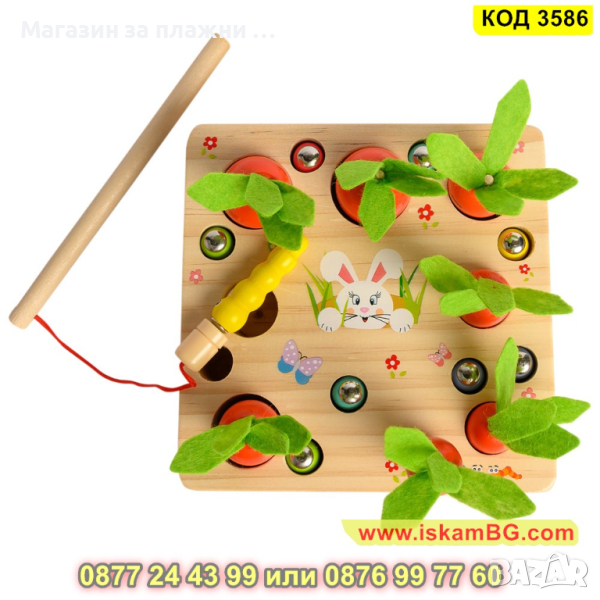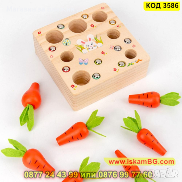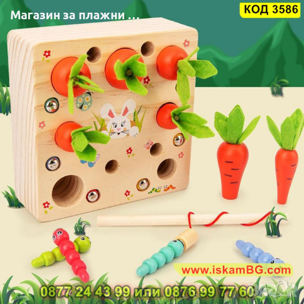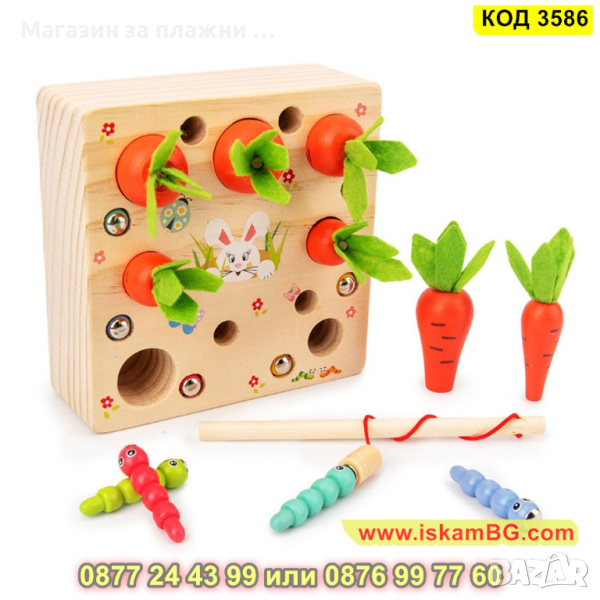 Детска дървена игра - сортер с моркови, въдица и червеи с вградени магнити - КОД 3586