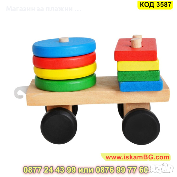 Детско дървено влакче сортер за дърпане с два вагона с куки - КОД 3587