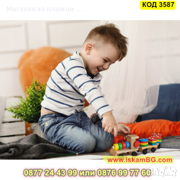 Пъстрото забавно влакче играчка за деца е изработено от дърво и има локомотив с два вагона на колела, които представляват сортери на блокове имащи различни геометрични цветни фигури. С тази играчка детето Ви ще забрави за времето, защото то бързо ще отлети! Интересната дървена железница подарява чудесно забавление на малчуганите, които могат да бъдат машинисти! Вагоните са свързани чрез куки, всеки вагон представлява сортер за нанизване на цветни блокчета. Дървеният влак с вагони ще подобри сръчността на детето и точността на пръстчетата му.