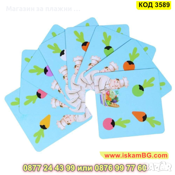 Втори начин за игра: Всяко дете тегли картата. За да помогнете на главния готвач да намери съставките, от които се нуждае днес, а децата, трябва да открият правилните зеленчуци. Който завърши първи, печели. Детето трябва да помни, кой зеленчук кде е засаден и спрямо изтеглената карта да ги извади и да приготви супа с тях.