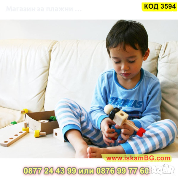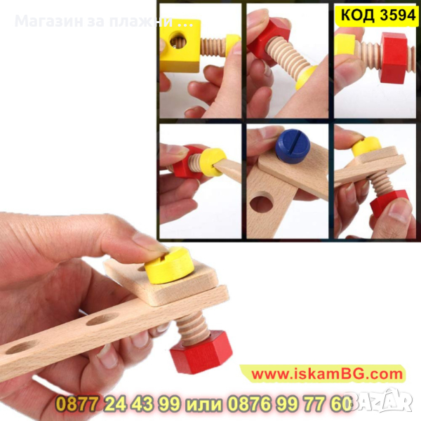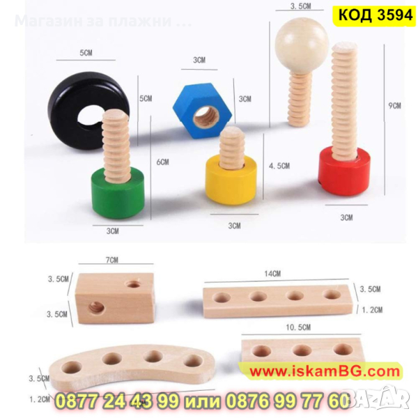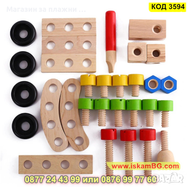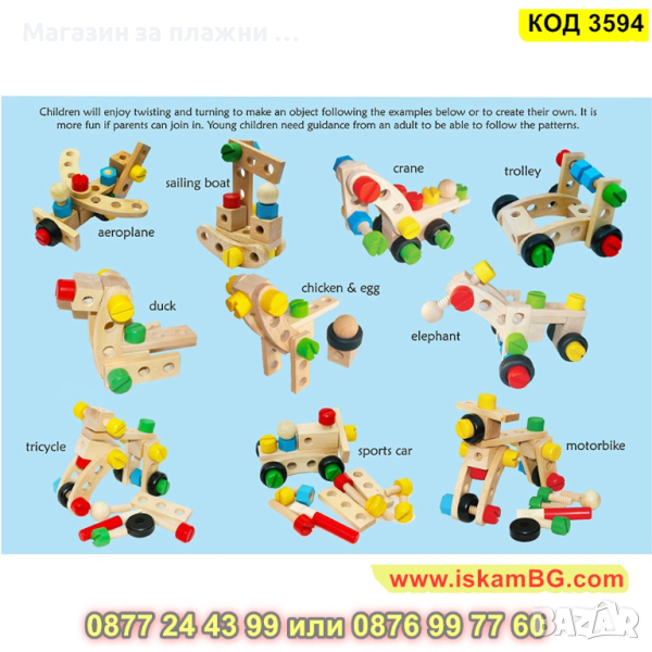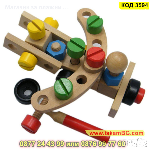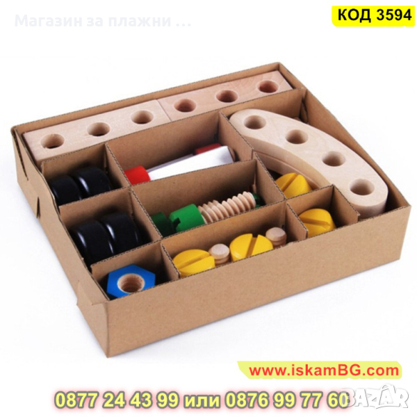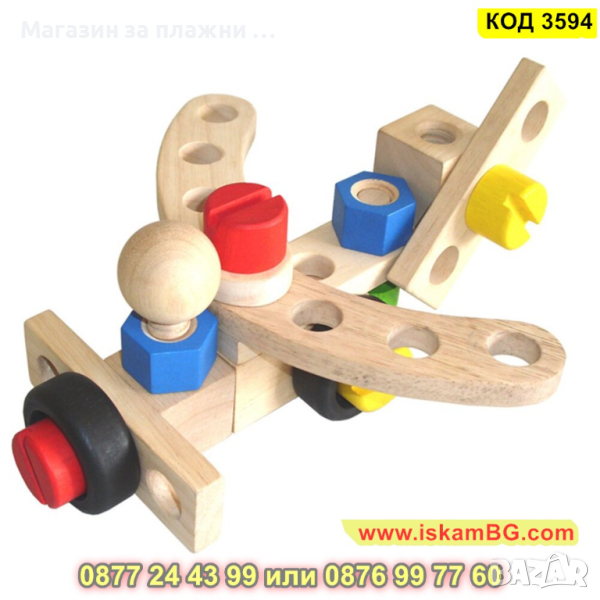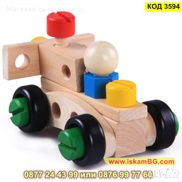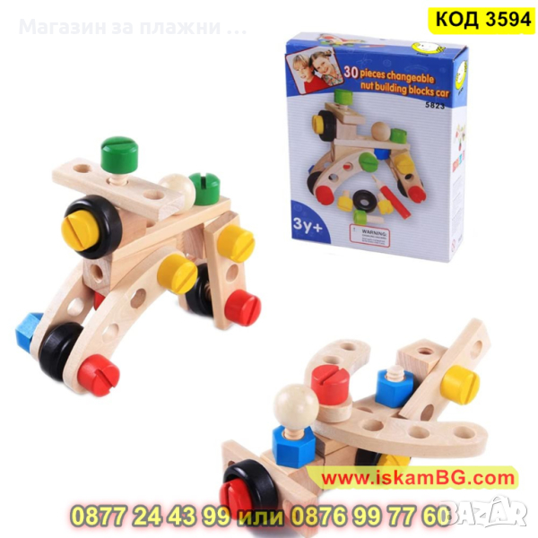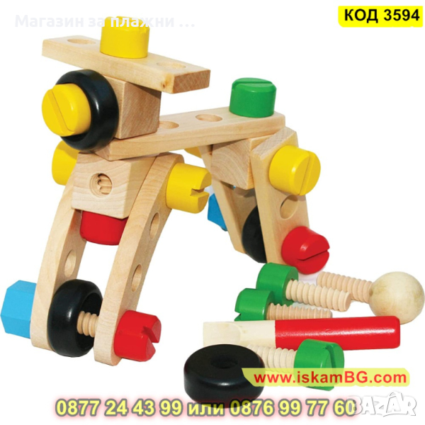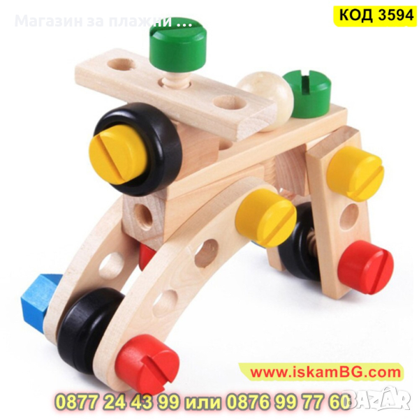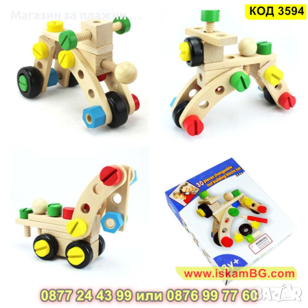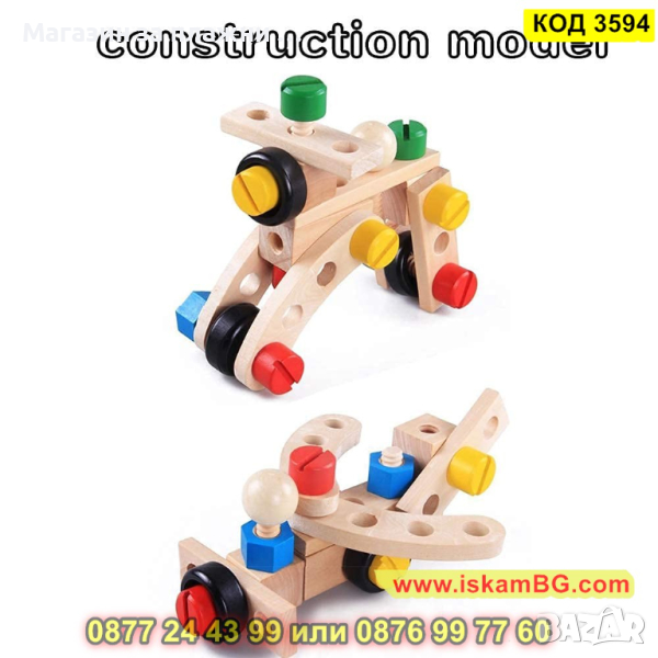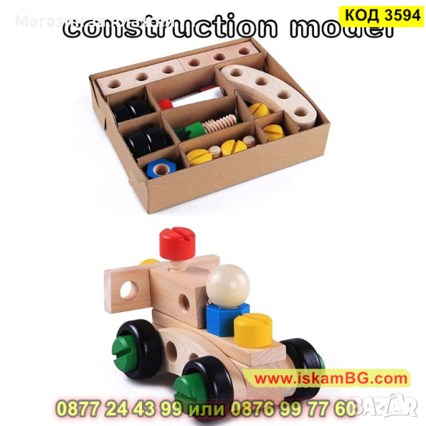 Дървеният строителен конструктор е един чудесен начин, с който децата могат да развият своите умения, да се научат да разпознават различните цветове както и да подобряват координацията си. Комплектът включва 30 части, които дават възможност на малчуганите да създадат различни предмети, животни, коли и други. Дава се пълна свобода на въображението. Този строителен комплект се състои от болтове, винтове, летви, колела и детска отвертка и е подходящ за деца над 3 годишна възраст.