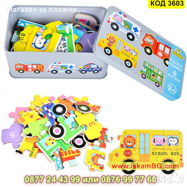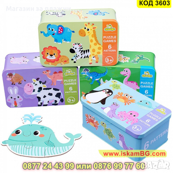 Материал: метална кутия, пресован картон за пъзела