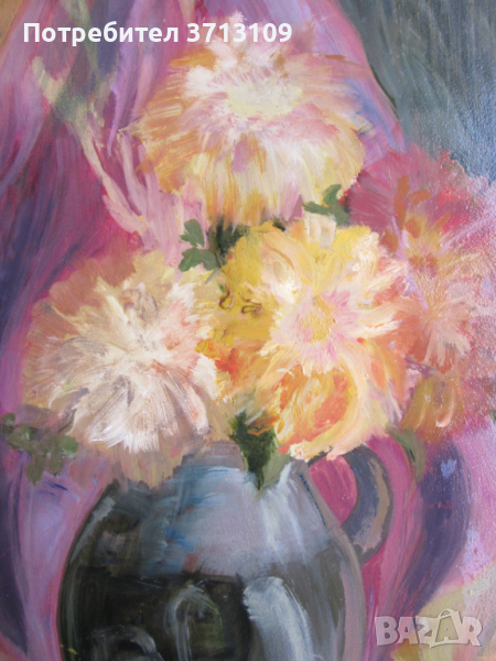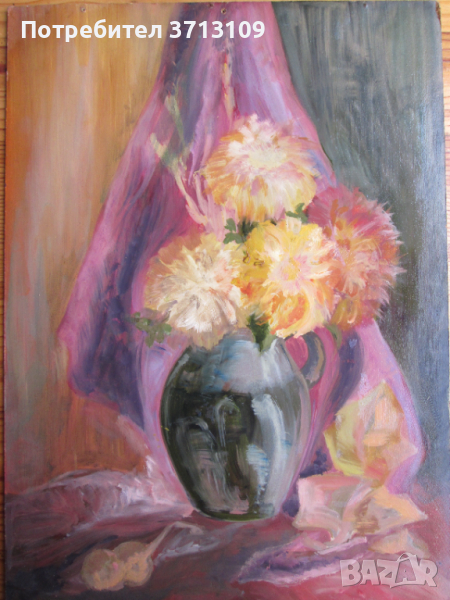 Картина -масло, фазер, ваза с хризантеми,51х36см. → Обява 45055502