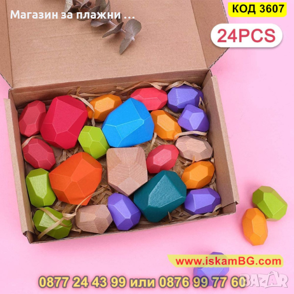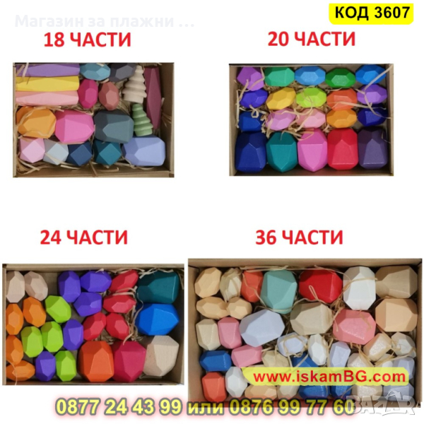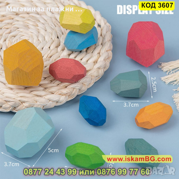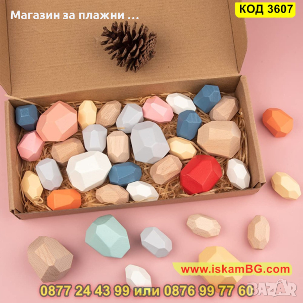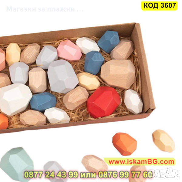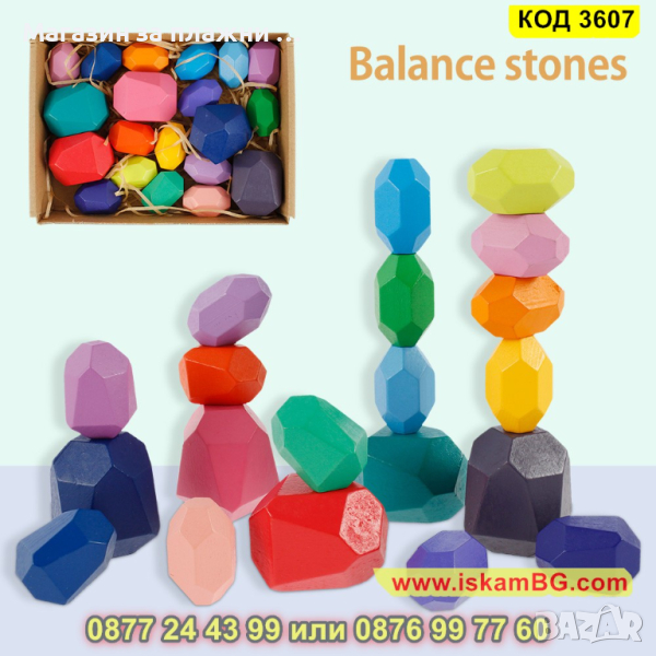 Балансираща игра, състояща се от дървени, цветни камъчета, в три размера. Камъчетата са поставени в картонена кутия.
