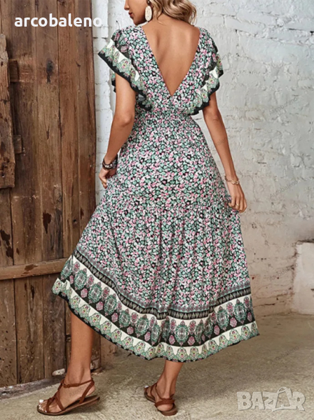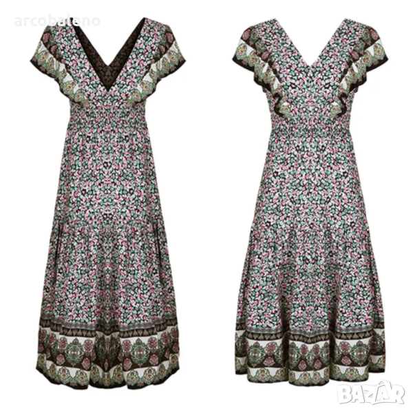 Дизайн: С очарователно V-образно деколте с волани и щампа по цялото тяло, тази рокля излъчва усещане за женственост и елегантност. Бохемският стил добавя нотка еклектичен шик към вашия гардероб.