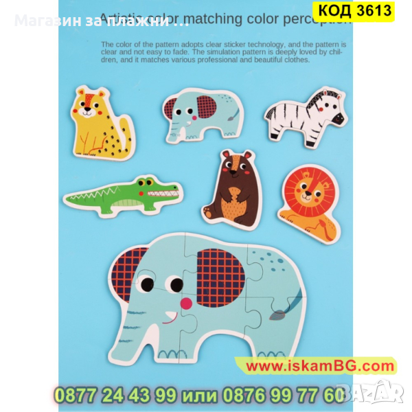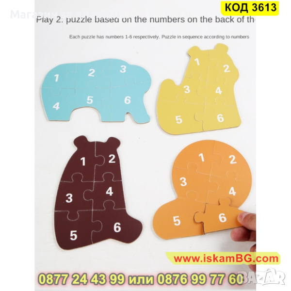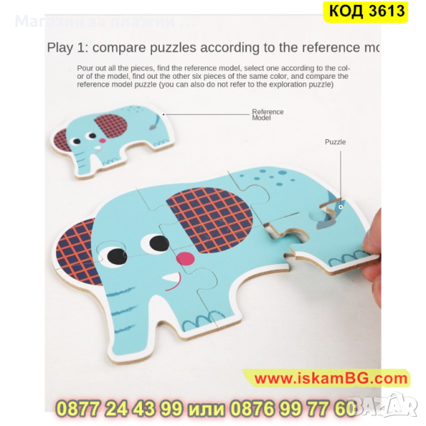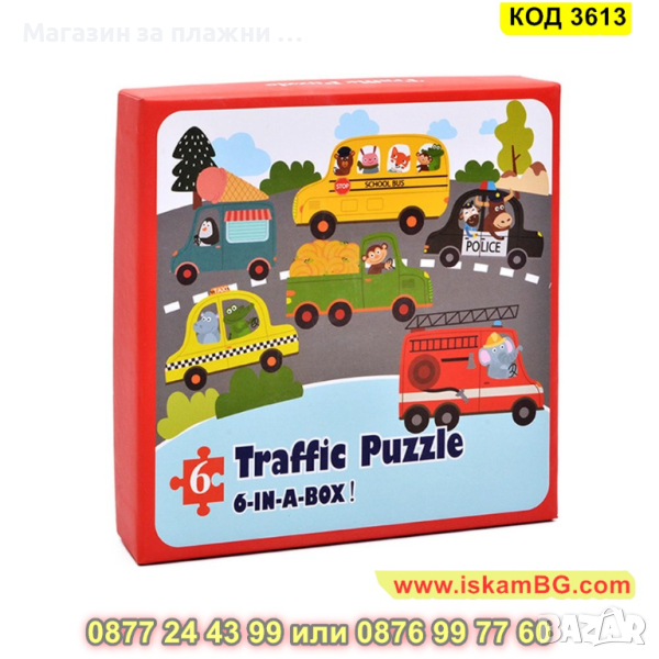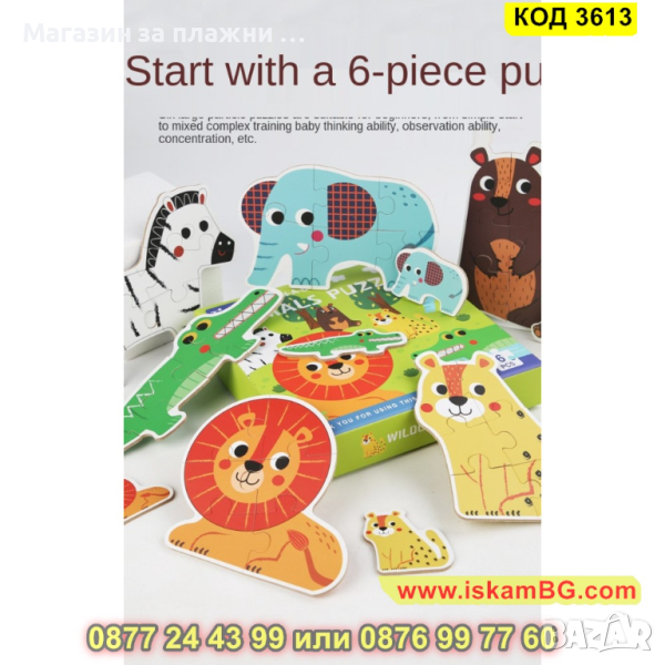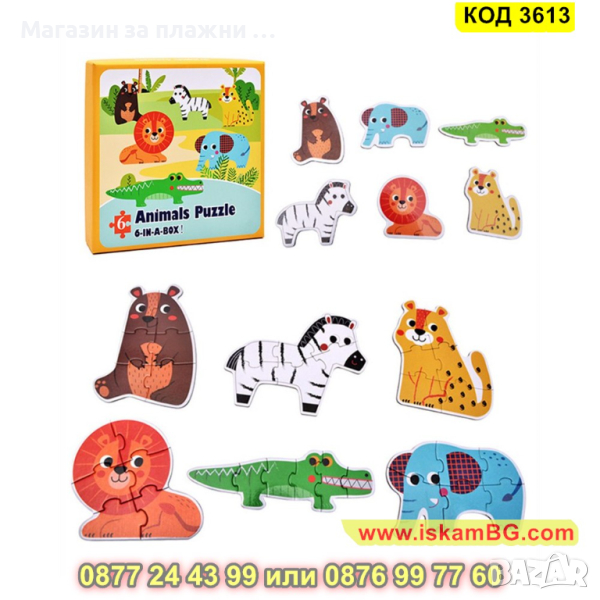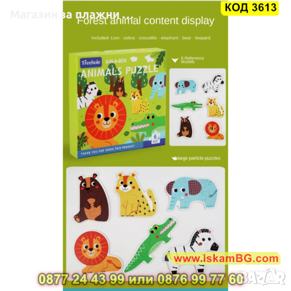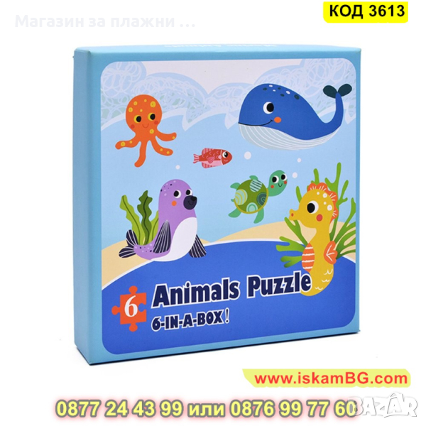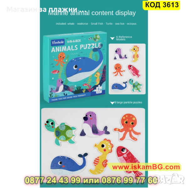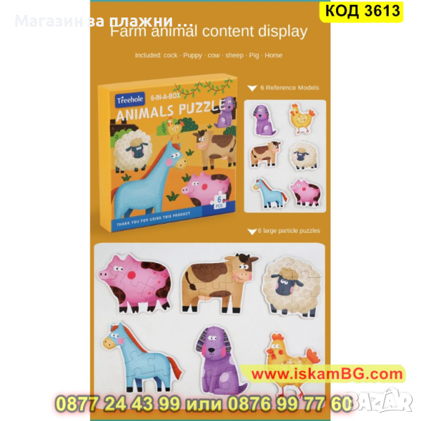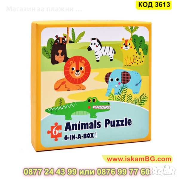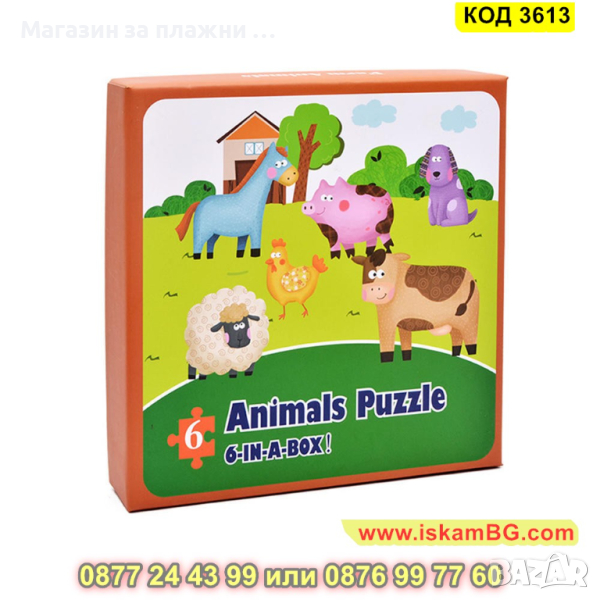 Кутия с 6 големи пъзела за сглобяване и 6 бр. малки фигурки по които да се гледа, как трябва да се сглоби пъзела