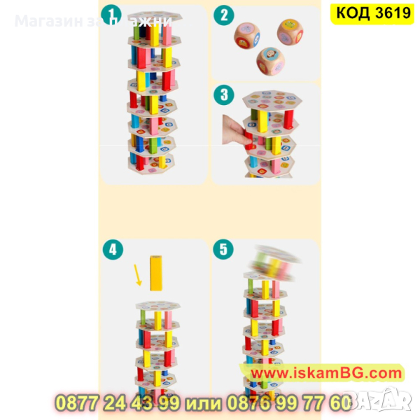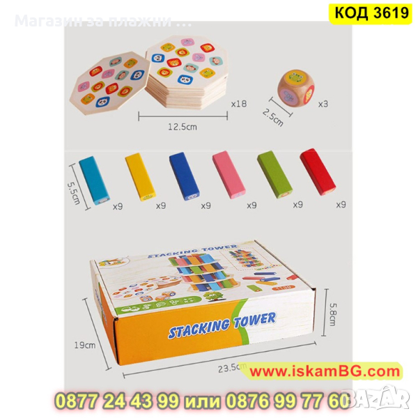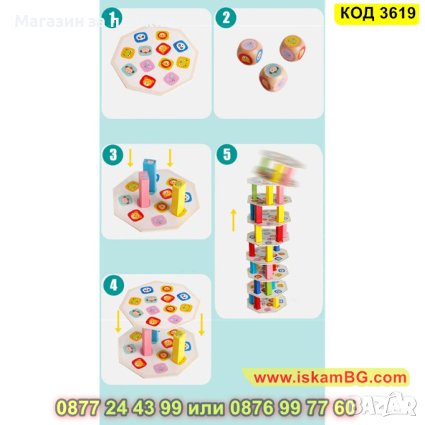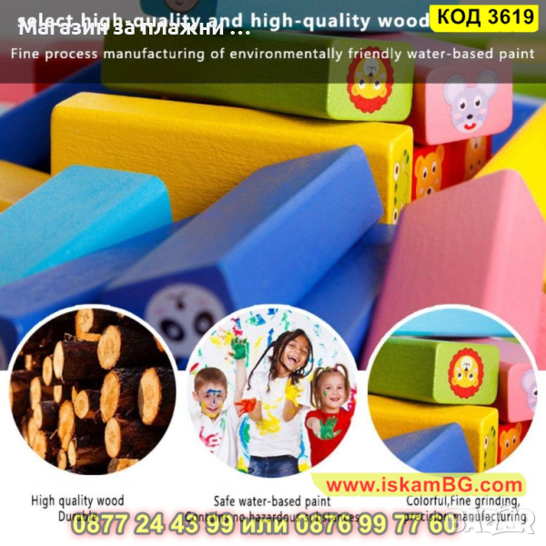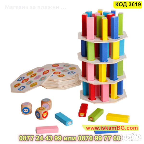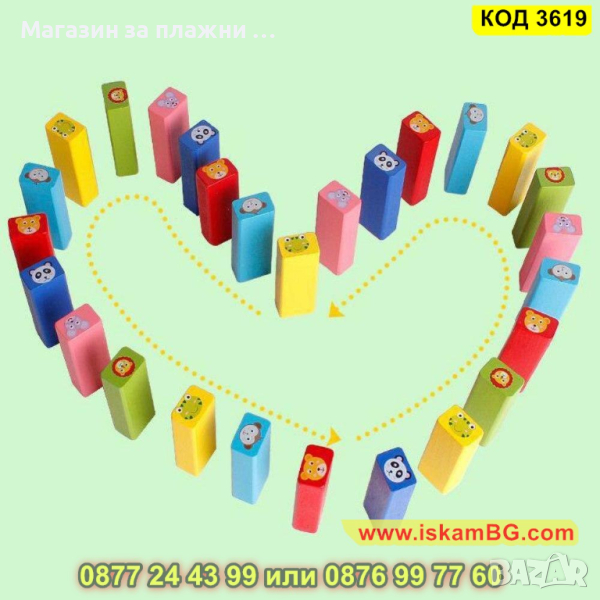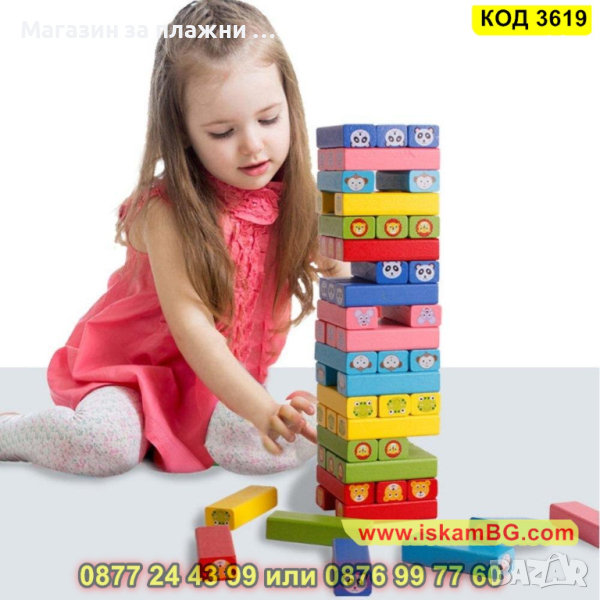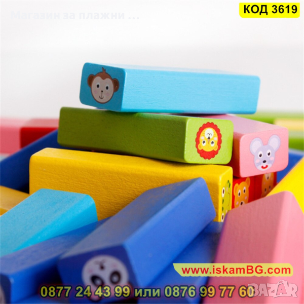 54 бр. дървени блока в 6 цвята (жаба, лъв, маймуна, мишка, мече и коала)