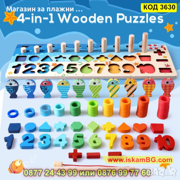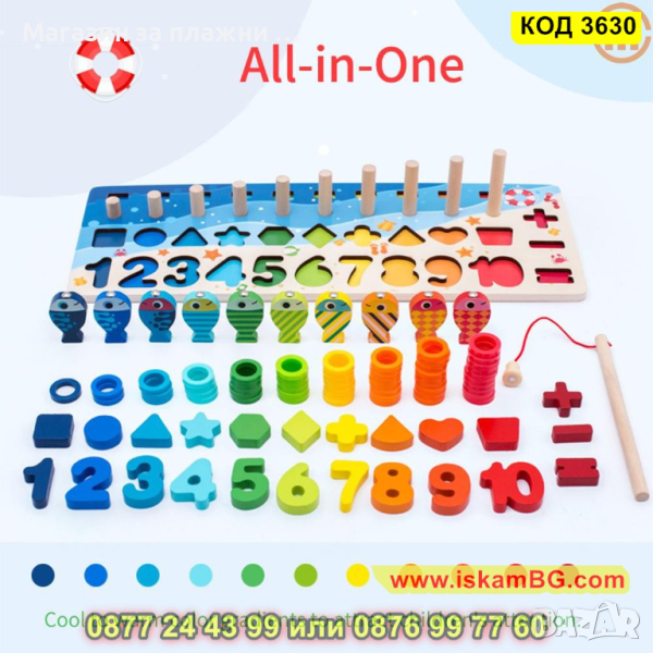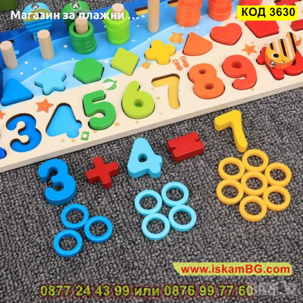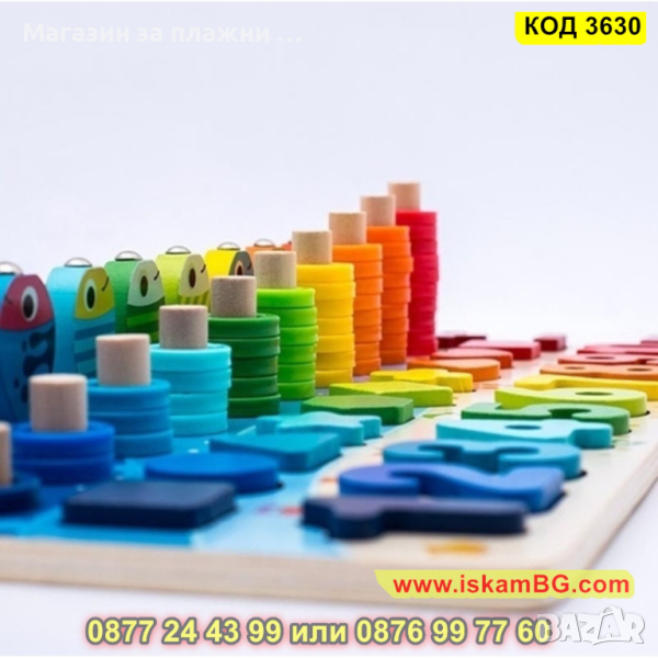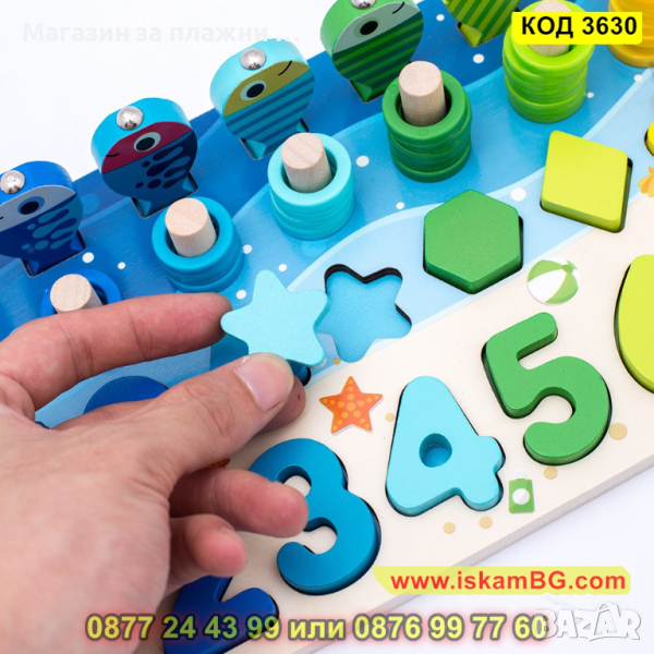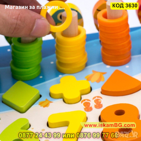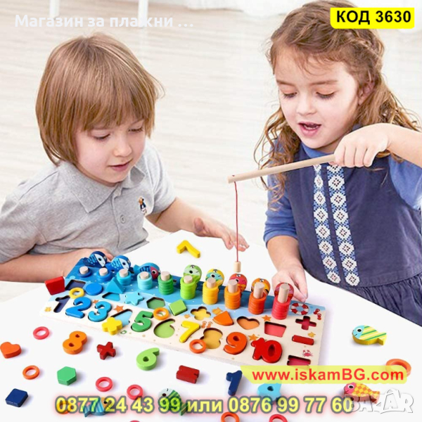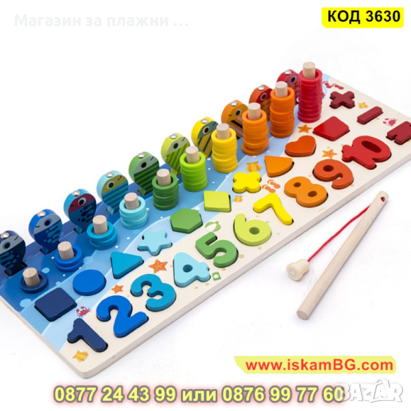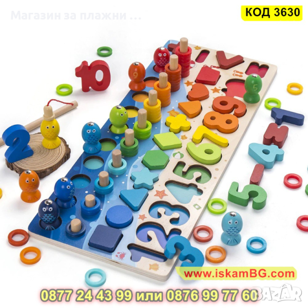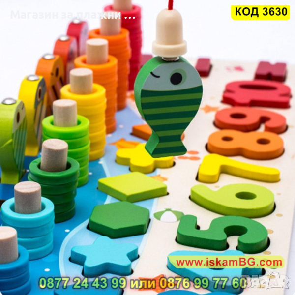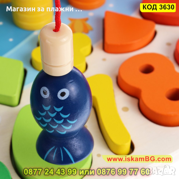 Дървена дъска с цифри, геометрични форми, низанка с рингове и магнитен риболов.