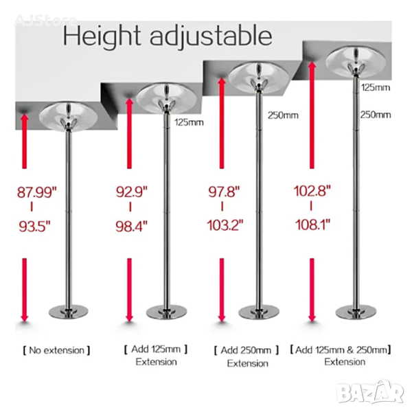 пилон или статистичен по ваш избор има диаметър 45 мм и е идеален за начинаещи, средно напреднали или професионални танцьори. Със сигурност ще превърне тренировките ви във вълнуващо забавление или ще внесе нотка пикантност във вашите партита или танци с приятели. Пилонът е с регулируема дължина и има и две допълнителни разширения, така че да пасне на тавани с височина 2,24 - 2,75 м. Устойчивата метална рамка гарантира здравина на продукта, пилонът е достатъчно издръжлив, за да могат двама души да танцуват едновременно на него. Преносимият пилон не изисква закрепяне за тавана и може да се разглоби за минути и да се прибере за съхранение. Подвижен и преносим, пилонът е лесен за сглобяване и почистване, с ергономичен дизайн и изглежда чудесно на всякакъв интериор.