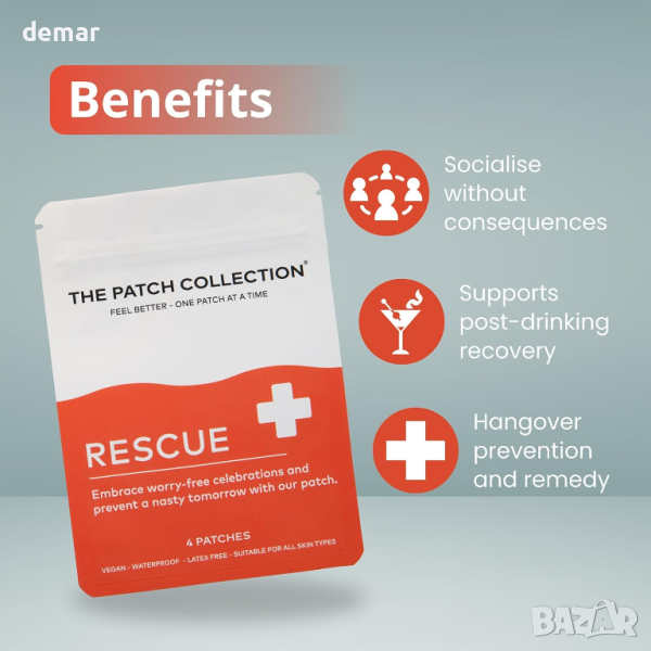 Rescue Patch е вашият най-добър спътник за всеки празничен повод, от фестивали и сватби до нощни разходки и плажни клубове, осигурявайки надеждна подкрепа за поддържане на партито. Това е икономично решение за предотвратяване на махмурлук, което струва само малка част от обичайните ви нощни разходи. Този пластир разполага с формула с продължително освобождаване, пълна с антиоксиданти, витамин В комплекс и куркума, осигуряващи стабилно вливане на основни хранителни вещества през кожата ви в кръвния поток, което го прави незаменим за празненства през уикенда. Неговото дискретно и лесно приложение ви позволява просто да залепите пластира върху всяка чиста, суха област от кожата си, преди да започнете нощта си, и да го носите до 12 часа за безпроблемно, контролирано освобождаване. Изработени с честност и простота, съставките са на растителна основа, веган, без латекс, водоустойчиви и подходящи за всички типове кожа, стриктно тествани за качество и чистота. Със спасителните лепенки прегърнете едно безгрижно празнуване, без да се тревожите за следващия ден.