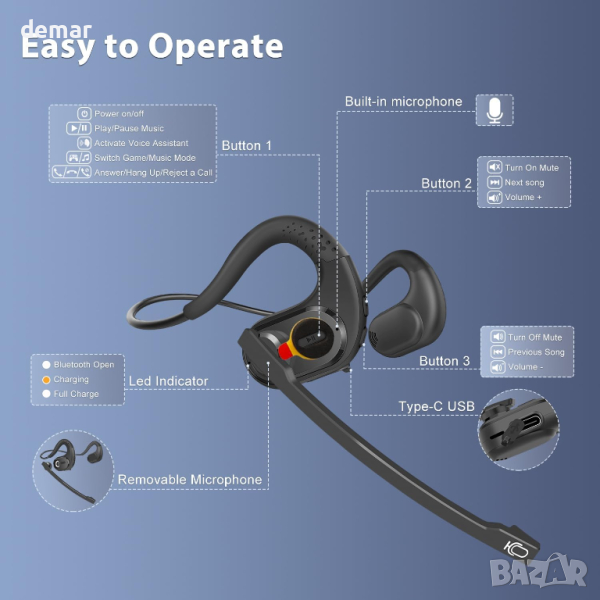 Слушалките с отворено ухо G9 предлагат отличителен дизайн с отворено ухо, който предпазва ушния канал без препятствия, поддържа хигиената и сухотата на ушите, без да жертва екологичната осведоменост, което е от решаващо значение за безопасността по време на дейности на открито. Той може да се похвали с първокласно качество на звука с Bluetooth 5.3 технология, осигуряваща кристално чист звук с дълбоки, богати тонове за изключително изживяване при слушане. DSP шумопотискащият микрофон на стрелата, магнитно прикрепен за удобство, гарантира ясна комуникация чрез прецизно улавяне на гласа ви и намаляване на фоновия шум, идеален за разговори и виртуални срещи в различни платформи като Skype, Zoom и MS Teams. Тези слушалки осигуряват многофункционална Bluetooth свързаност, позволяваща едновременно сдвояване на две устройства за безпроблемно превключване между разговори и медии, гарантирайки, че никога няма да пропуснете нито един момент. Проектирани за носене през целия ден, слушалките G9 са леки и ергономично изработени, за да се поберат сигурно и удобно за до 12 часа при 1,5-часово зареждане, предлагайки непрекъснат безжичен комфорт, независимо дали сте у дома или в движение.