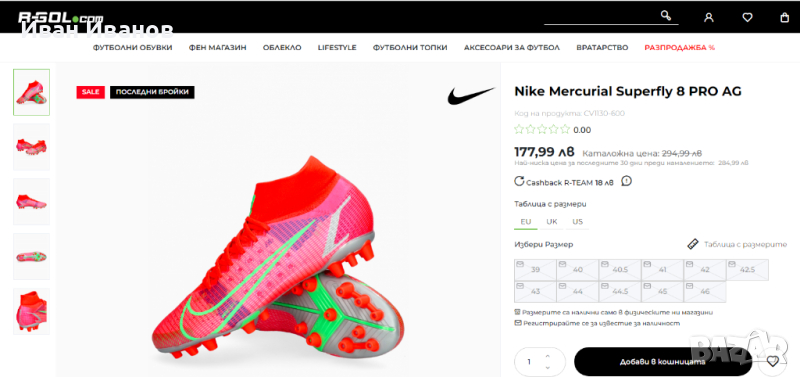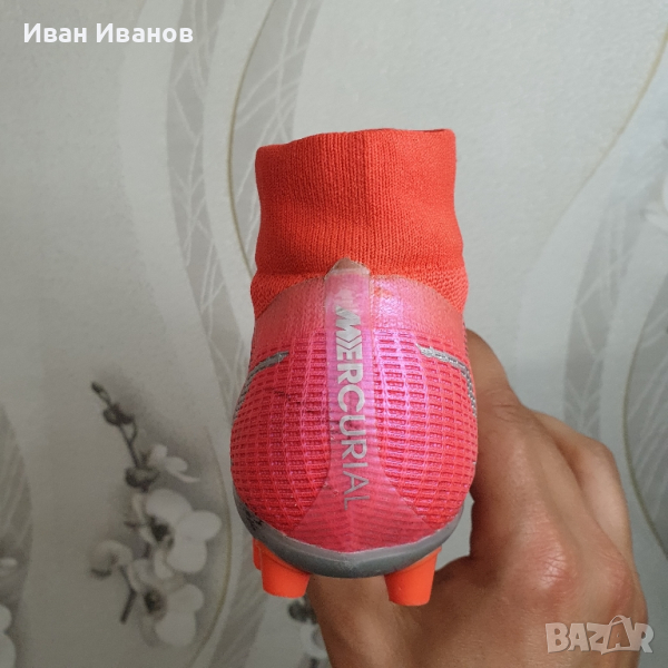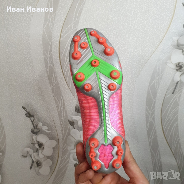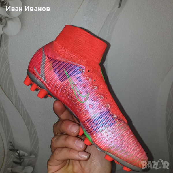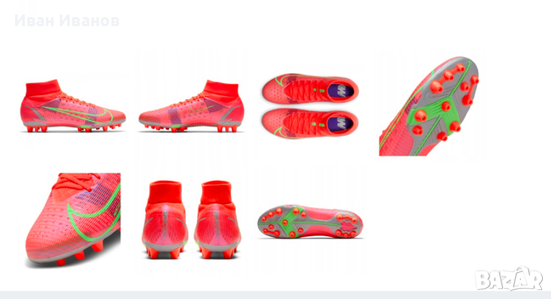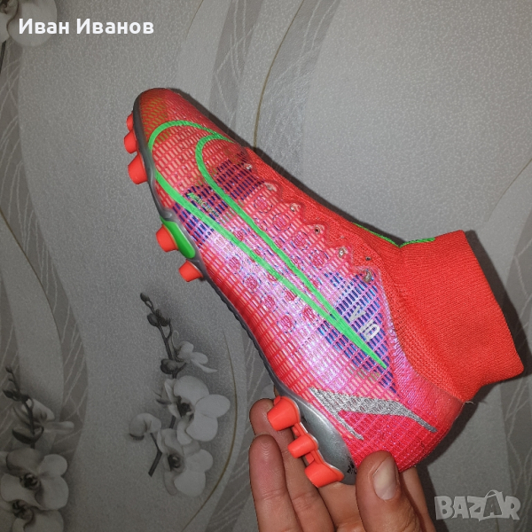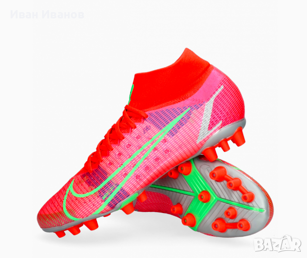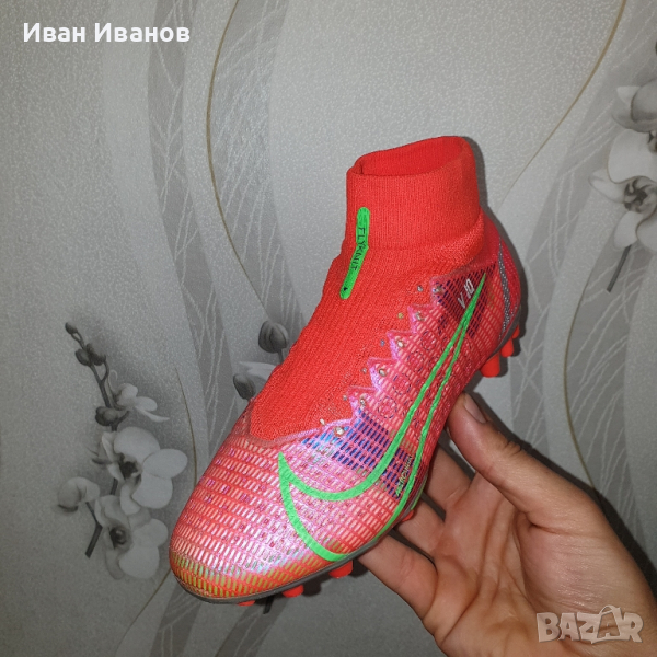 Nike Mercurial Superfly 8 Pro AG CV1130-600Използвани два пъти , като нови , без следи и забележки , Цена по магазините около 250 лева носен от Кристиано Роналдоновият Mercurial е дефиницията за технология, годност и скорост.първокласна синтетична горна част.конфигурация на шипове за оптимално сцеплениединамична якаAG ботуши за изкуствена трева.Nike Mercurial Superfly 8 Pro AG-PRO Spectrum е най-новата част от емблематичната серия футболни обувки и не ви разочарова! Отличаващ се с олекотена конструкция за максимална гъвкавост по време на носене, както и с подобрено докосване, за да помогне за подобряване на представянето върху повърхности с изкуствена трева, това ново предложение със сигурност ще осигури часове удоволствие. Най-хубавото от всичко е, че KICKS CREW предлага богат избор от стилове и цветове, от които да избирате, така че да можете да намерите най-подходящия за вашите нужди. Пригответе се да разгърнете вътрешната си скоростна игра на всяка повърхност!Надграждайки Phantom GT, Nike Phantom GT2 Pro Dynamic Fit FG има актуализиран дизайн и повдигната шарка за генериране на оптимално въртене и контрол на полета на топката. Изместената от центъра връзка осигурява чиста зона за попадение за умело дриблиране, подаване и стрелба. Почувствайте как конструкцията BallFlyknit и яката Dynamic Fit обвиват крака ви в еластични прежди за леко прилепване, подобно на чорап. Те осигуряват подкрепата, от която се нуждаете, за да надиграете опонентите си. Изместената от центъра връзка с гладка повърхност създава по-голямо приятно място за мощни снимки. Take Control Графичната текстура в горната част е стратегически разположена за прецизно докосване при стрелба, пас и дрибъл.футболни обувкипредназначени за игра върху изкуствени настилкиединствената по рода си минималистична Flyknit горна част е направена само с необходимите материали, което води до по-ниско тегло на обувкитениво: обучение / полупрофесионалноомекотената стелка осигурява комфортиновативната подметка дава гъвкавост за извършване на по-бързи завои с висока скоростЯката Dynamic Fit е изработена от мек, гъвкав материал и прегръща глезена за плътно прилепванеколекция: пролет 2021гОбувката Nike Mercurial Superfly 8 Pro AG има изцяло нов външен вид с нови елементи, които ви позволяват да играете по-бързо от началото до края. Гъвкавата яка добавя опора, а иновативната пластина ви дава отскок, който ви позволява да правите по-бързи завои при висока скорост.