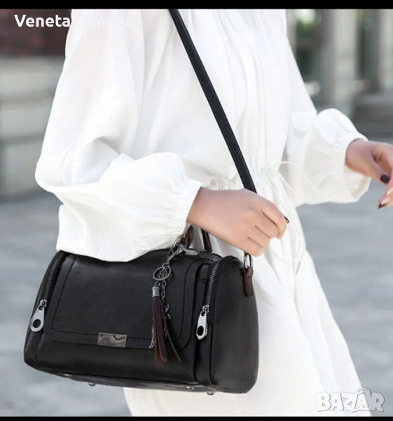Черна дамска чанта от екокожа с къса и дълга дръжка → Обява 45068372
