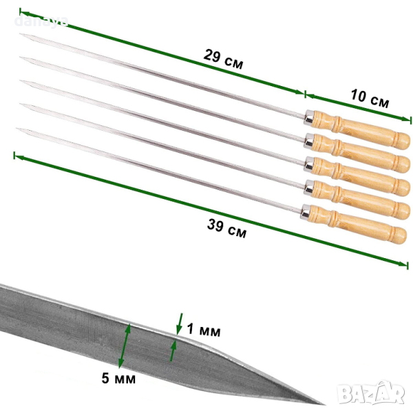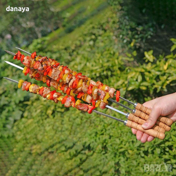 шишове с дървени дръжки изработени от неръждаема стомана. Идеалният избор за приготвяне на скара или барбекю. Дървената дръжка осигурява безопасно използване на шишовете, без опасност да изгорите ръката си. Острите върхове гарантират лесно захващане на продуктите.