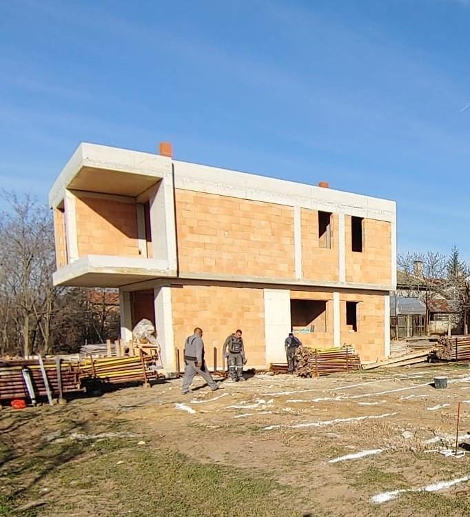 Първи етаж: Застроена площ 69,4 кв.м, включваща входно антре, стълбище към втори етаж, просторна дневна с кухненски бокс и трапезария, баня с тоалетна, килер и складово помещение.