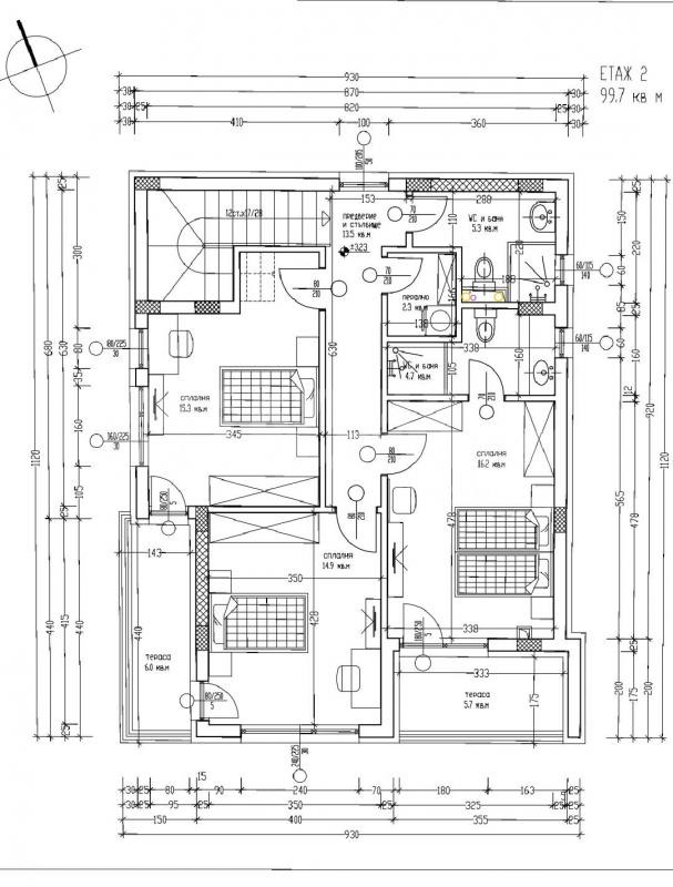 Втори етаж: Застроена площ 99,7 кв.м, състоящ се от три спални. Едната спалня разполага със собствен санитарен възел и тераса, докато за другите две спални е предвиден общ санитарен възел и тераса. На този етаж има и перално помещение.