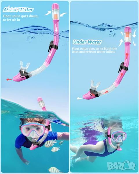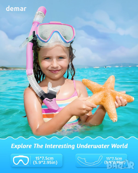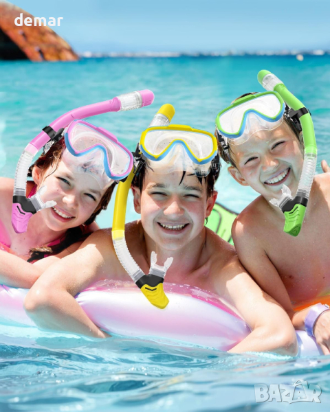 Тази прозрачна панорамна детска маска за гмуркане с шнорхел предлага ярки подводни гледки със своите лещи от закалено стъкло против замъгляване, предназначени да предотвратяват замъгляването и да издържат безопасно на дълбоко водно налягане. Маската разполага с удобна, непропусклива силиконова пола и регулируема лента за глава за плътно прилепване, без да оставя следи. Удобният за начинаещи джоб за нос предотвратява навлизането на вода. Шнорхелът има висококачествен силиконов изпускателен клапан и сух горен клапан, за да предпази водата, осигурявайки безпрепятствено дишане. Ергономичният мундщук за храна остава удобен с течение на времето, а еднопосочният клапан за продухване позволява лесно изчистване на водата. Фиксирана катарама закрепва шнорхела към маската. Изработен от издръжливи материали, този комплект за гмуркане с шнорхел за деца е идеален за гмуркане, плуване и приключения с шнорхел. Преди употреба се препоръчва практика в басейн