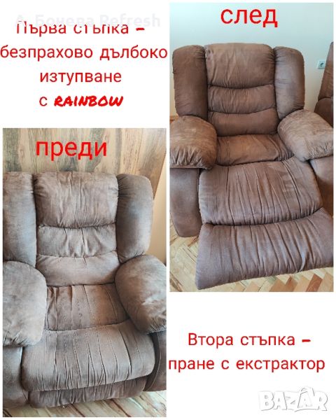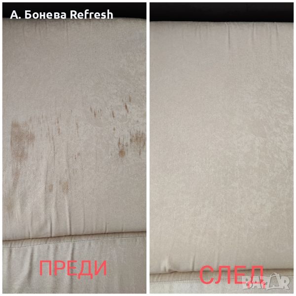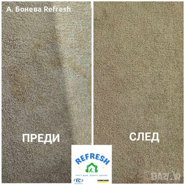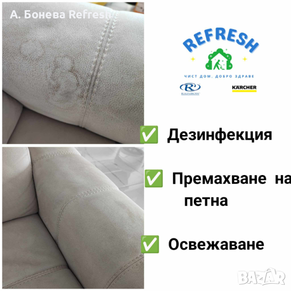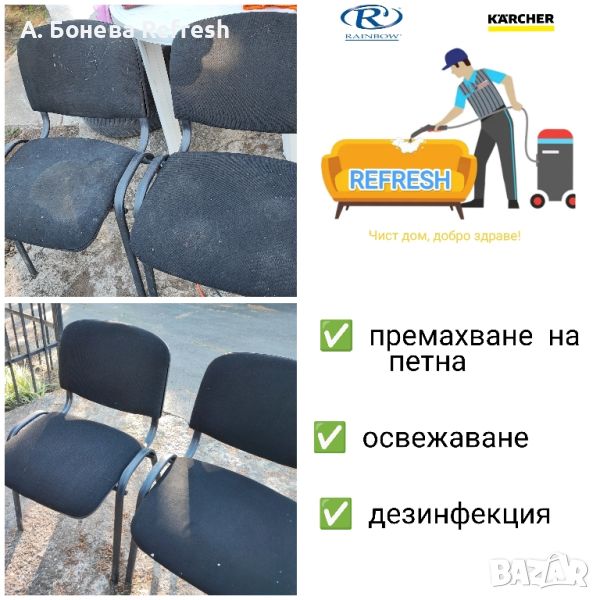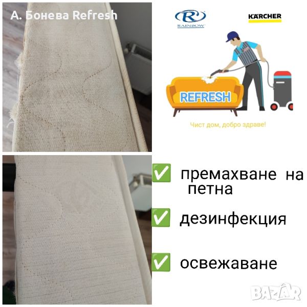Чистия дом е равносилен на добро здраве, силен имунитет, комфорт и уют. Ние искаме да Ви ги осигурим. С доказан опит и в чужбина екипът на Refresh ще дари Вашата мека мебел с втори живот, а Вас с една голяма усмивка! Предлагаме професионално машинно пране с екстрактор Kärcher и/или изтупване на мека мебел със система за почистване Rainbow -дивани, столове, матраци, фотьойли, тапицерии на коли, килими, мокети и др. Ще дойдем в удобно за Вас време на адрес в Бургас и региона. Доверете се на професионализма, подарете си чист дом с нас.Услугата професионално машинно пране е подходяща при:> Замърсени дивани, мека мебел, матраци, топматраци, мокети и килими;> Почистване на матраци от акари, отстраняване на урина от малки деца, домашни любимци (кучета, котки );> При наличие на гъбички и бактерии, мухъл>При наличие на петна по вашият диван, мека мебел, матрак, топматрак, автотапицерии>При неприятни миризми> При необходимост от дезинфекция и освежаванеМинимална поръчка > 65€.При адрес в синя зона, престоят е за сметка на клиента.Услугата се извършва и в следните квартали: Ветрен, Банево, Горно Езерово, Долно Езерово, Сарафово, Крайморие, Лозово, Меден Рудник и региона на град Бургас като се заплаща транспорт .При интерес и запитване за цена пишете на лично съобщение или позвънете на телефон > 08******55Чист дом, добро здраве!Последвайте ни и във Facebook > refreshprane