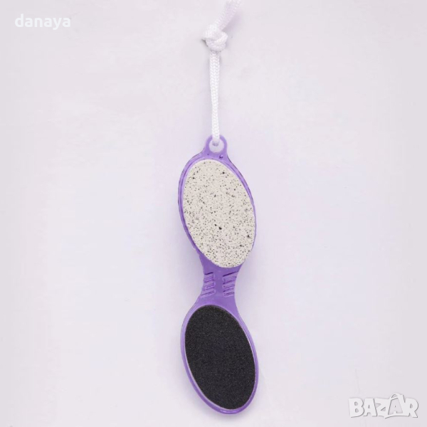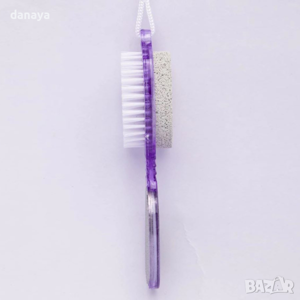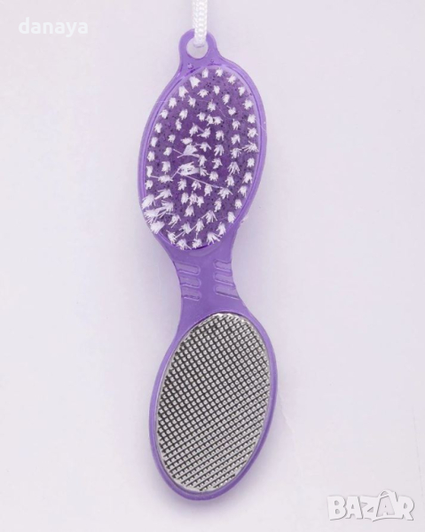 Четка за крака 4 в 1. Снабдена с пемза за почистване на загрубяла кожа от стъпала и пети; четка за почистване; метална част за почистване на загрубяла кожа и мазоли; полировъчна част за мека и гладка кожа. Четката се предлага в картонена опаковка. Различни цветове.