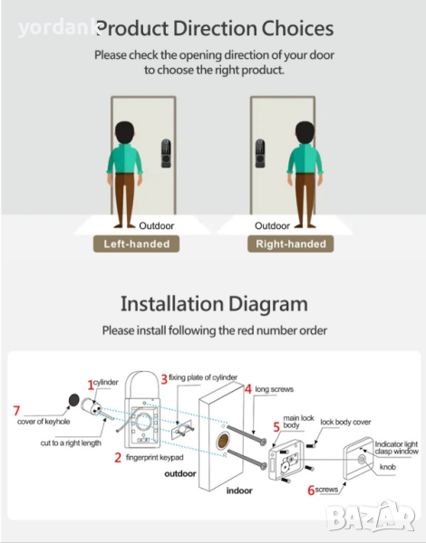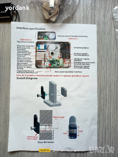 NB. Освен това има традиционното отваряне с ключ за спешни случаи. Характеристика: Няколко начина за отключване: Тази ключалка поддържа 6 различни начина за отключване: пръстов отпечатък, код, парола, смартфон, RFID етикет, ключове. Позволява до 100 пръстови отпечатъка, 100 пароли, 100 лични карти и 30 проверки. Предупреждение за изтощена батерия, позволява още до 50 отваряния след предупреждение. Дистанционно управление i контрол: След като се свържете с WiFi шлюза, можете да заключите или отключите интелигентната си ключалка навсякъде и по всяко време чрез ПРИЛОЖЕНИЕТО, изпращайки кодове до вашето семейство или приятели, за да получите контрол над дистанционните. Лесна инсталация: Този комплект интелигентни брави се инсталира лесно за минути и не е необходим професионалист, можете да завършите инсталацията сами. Уединен дизайн на ключалката: Когато ключалката на вратата внезапно се разреди, можете да отворите вратата с ключовете и не е нужно да се притеснявате за проблемите, причинени от внезапната загуба на захранване. Пълен комплект: Този комплект интелигентни брави включва три ключа, цилиндър за заключване, две IC карти, ръководство за потребителя, водоустойчив силиконов панел и подложки