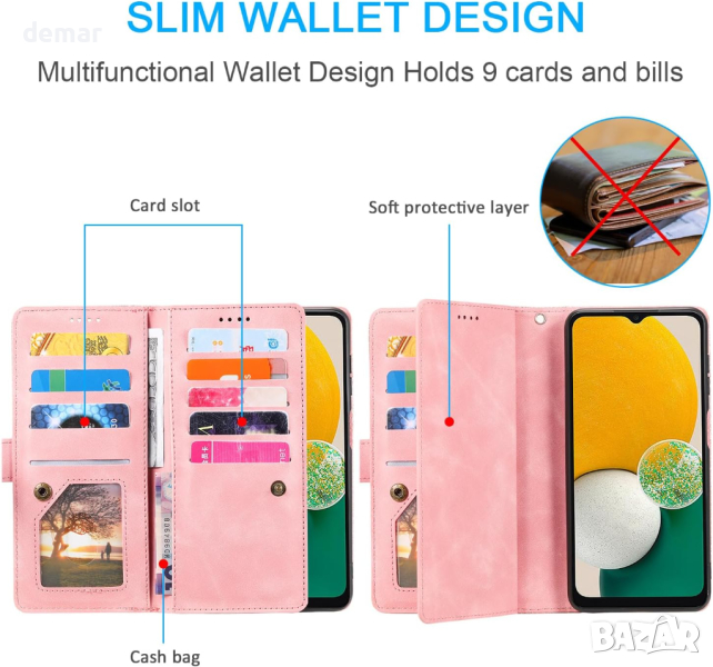 Първокласният калъф от PU кожа за Samsung Galaxy S24 5G съчетава стил и функционалност, предлагайки цялостна защита със своите издръжливи материали и дизайн на книга. Той разполага с мека TPU вътрешна обвивка за допълнителна безопасност, магнитна закопчалка за сигурно затваряне и удобна каишка за китка. С 8 слота за карти, слот за ID, 2 слота за пари и джоб за портфейл с цип, той елиминира нуждата от обемист портфейл. Калъфът включва и стойка за гледане със свободни ръце за лесен видео чат и гледане на филми. Сигурното му магнитно затваряне гарантира, че телефонът ви остава защитен, докато прецизните изрези осигуряват лесен достъп до всички функции на телефона, без да махате калъфа, което го прави идеален избор както за защита, така и за удобство.