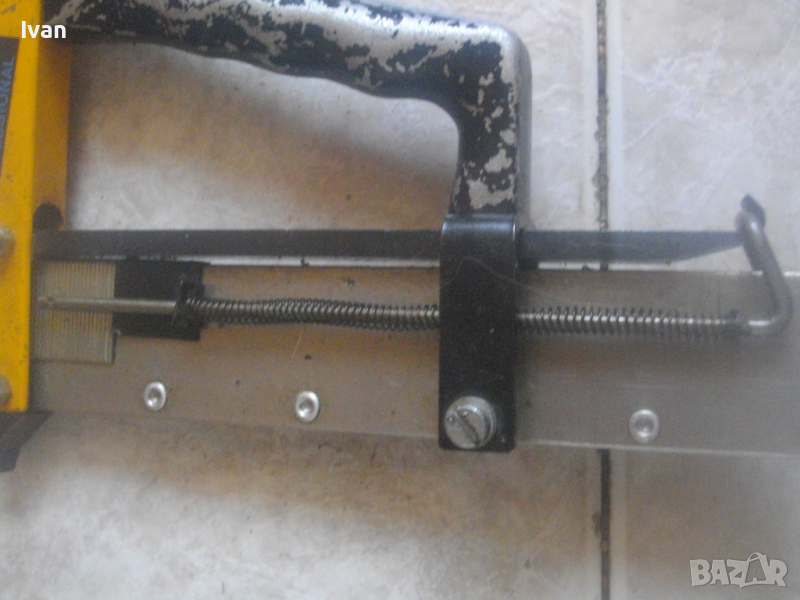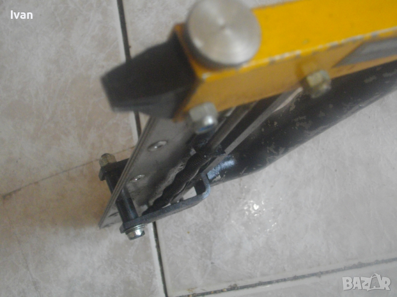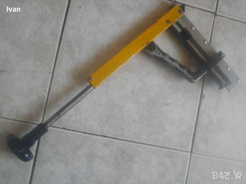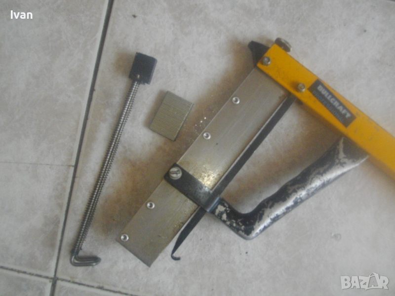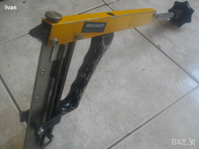 ОПИСАНИЕ на жълт ръчен такер голям - цена 159 лв. Професионален. Марка и модел BULLCRAFT PROFESSIONAL.Немско произовдство, старо качество. Масивен алуминиев изцяло корпус и дръжка предна. Заден кръг дръжка топка на лоста бутало за забиване на скобите - от бакелит, голяма. Пълнител метален, голям, за около 150 бр. скоби. Дължина на такера в отворено състояние на лостовото бутало - 43 см, дължина надолу на инструмента - 22 см. За скоби кламери размери от 8 мм до 29 мм. Такера е зареден с дузина скоби размер 22 мм за проба и тест в офис Еконт.