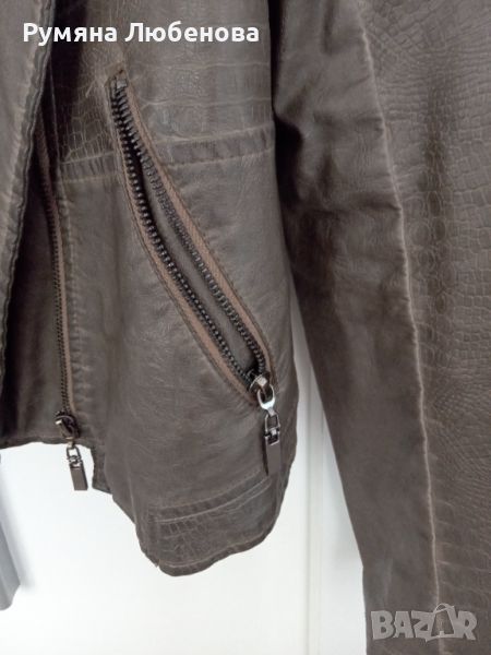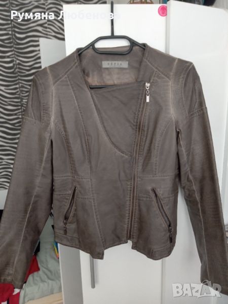 Дамско яке от изкуствена кожа. Както е видно от снимките - в безупречно състояние. Много приятен сиво зеленикав цвят. Носено не повече от три пъти. Купувано на много по-висока цена.