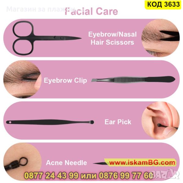 Няма нищо по-важно за една жена от усмивката, косата и... маникюра разбира се! Какво по-удобно от това да имаш всичко, от което се нуждаеш на една ръка разтояние... и то в компактен размер? Козметичен комплект от цели 10 части в луксозен кожен несесер. Подходящ за професионална или любителкса грижа за нокти и лице. Всяка дама дори и мъж трябва да го притежават за да имат перфектен маникюр и педикюр. Козметичния комплект съдържа и важни инструменти за лице.