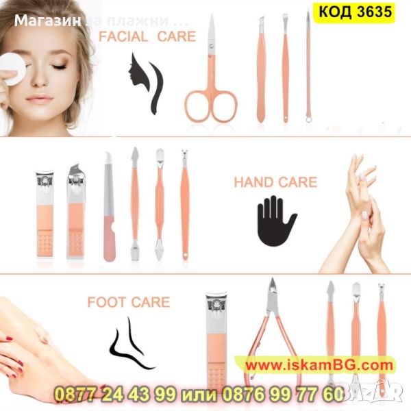 С компактен дизайн и стилно оформление, този набор включва всички необходими инструменти за оформяне, подрязване и полиране на ноктите, както и грижа за краката.