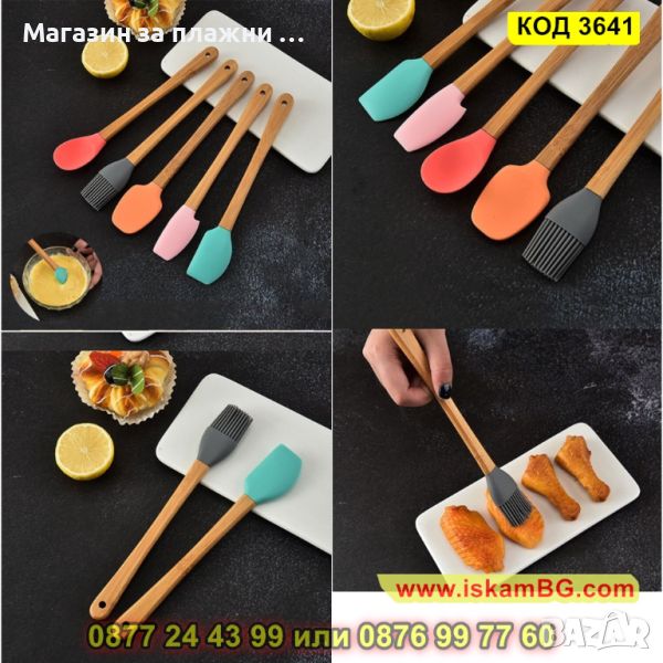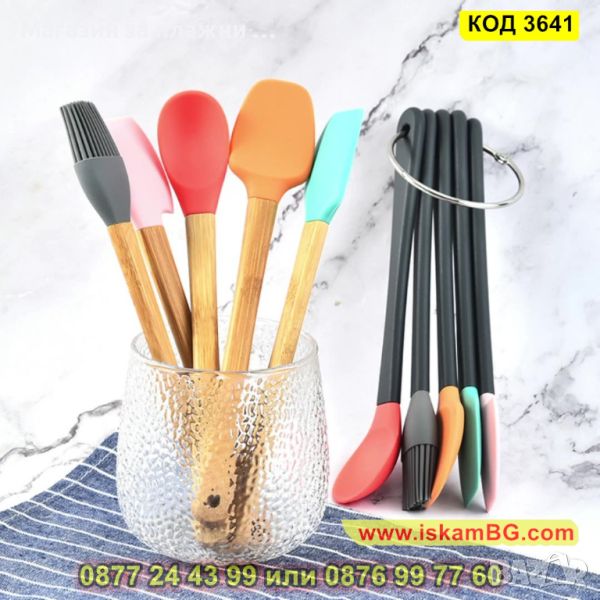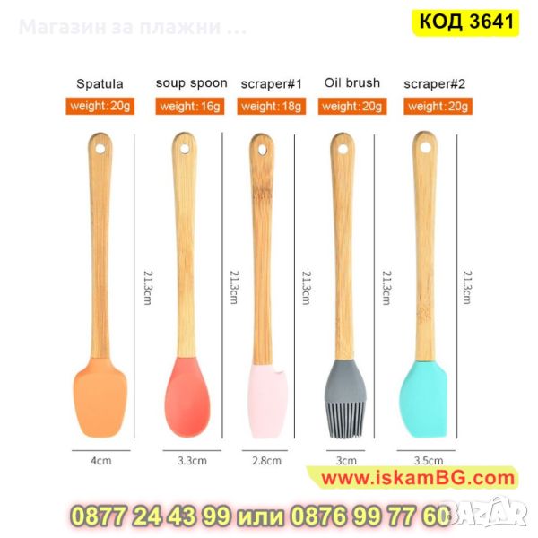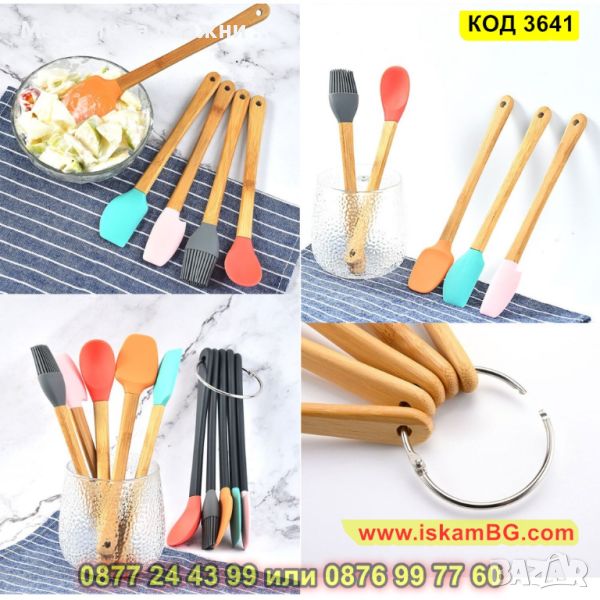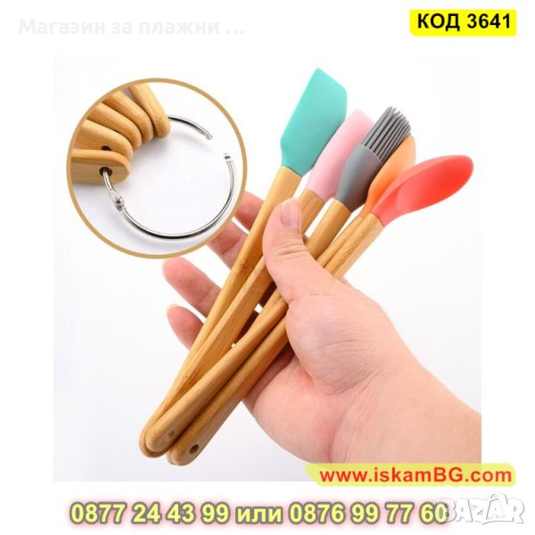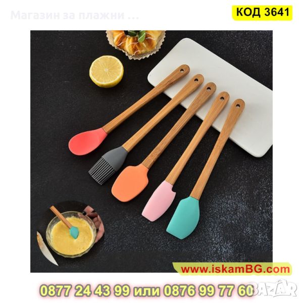 5 бр силиконови прибори идващи в комплект, с дръжки изработени от бамбук - КОД 3641
