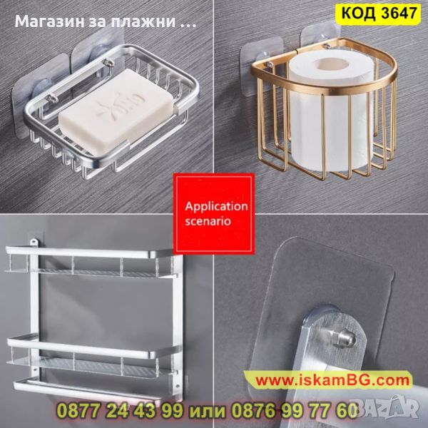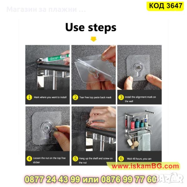 Самозалепващата се закачалка за окачване на етажерки се монтира лесно – чрез лепене и не е необходимо пробиване. Можете да я залепите върху различни повърхности – плочки, керамика, дърво или метал, но не я използвайте върху тапети или боядисана стена. Също така не поставяйте на нея ценни или лесно чупливи предмети. Важно е да се отбележи да не използвате масло, вода или други подобни вещества, за да не повредите лепилото й. Водоустойчива и маслоустойчива е, като понася натоварване до 5кг.