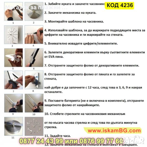 Стрелките на часовника се монтират без пробиване, чрез двойнолепящо тиксо. Лентата е на гърба на всеки елемент.