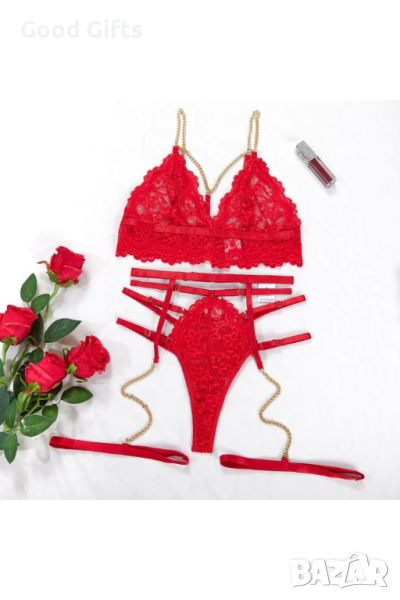 Отдайте се на очарованието на този комплект бельо- изкусителен, създаден да пленява и съблазнява. Изработен от изящна полиестерна материя, този комплект бельо от две части излъчва изисканост и елегантност. Сложните детайли, включително бродирана дантела и деликатна мрежа, създават завладяваща естетика, която е едновременно привлекателна и изискана. Частично прозрачната формована чаша предлага нотка на чувственост, като същевременно осигурява достатъчно подкрепа и комфорт. Този комплект бельо е олицетворение на лукс и стил.