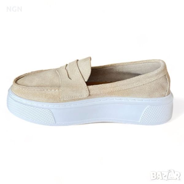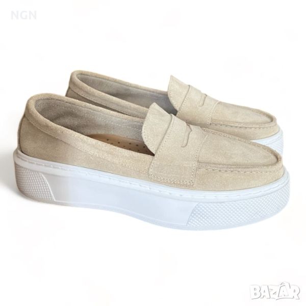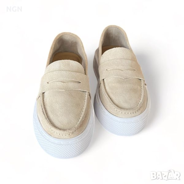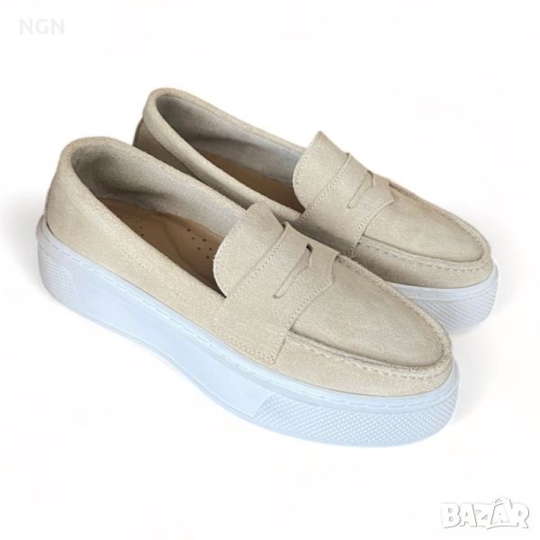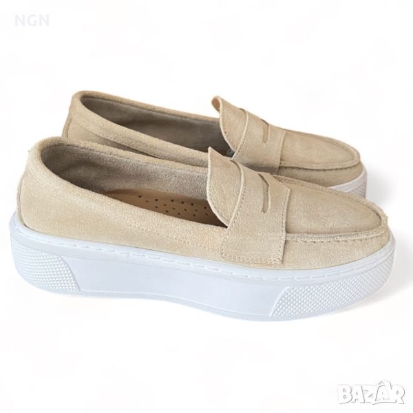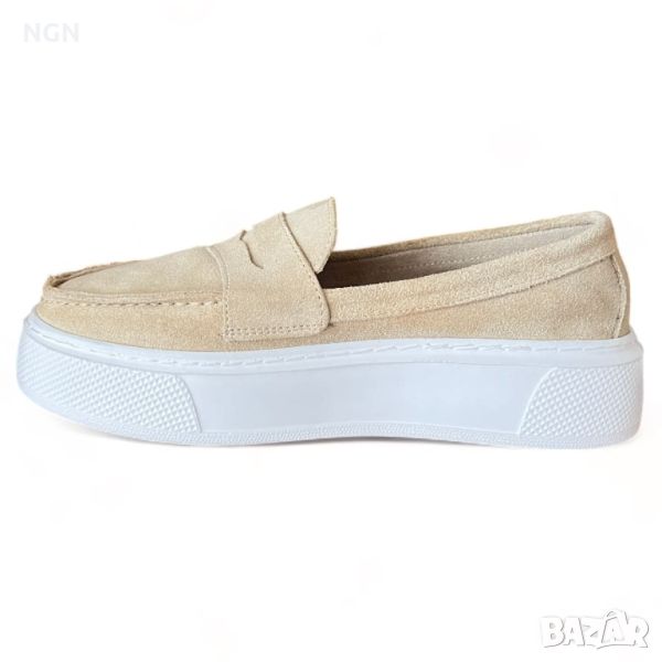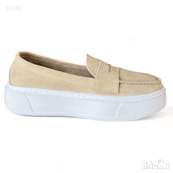 Удобни дамски обувки тип мокасини от естествен велур в бежов цвят с анатомична и комфортна стелка.